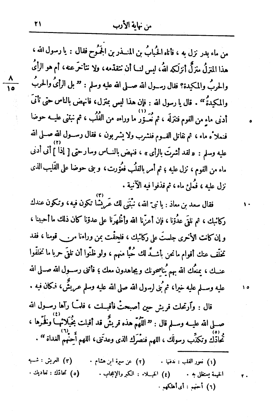 من ماء بدر نزل به، فأتاه الحباب بن المنذر بن الجموح فقال: يا رسول الله، هذا المنزل منزل أنزلكه الله، ليس لنا أن نتقدّمه، ولا نتأخر عنه، أم هو الرأى والحرب والمكيدة؟ فقال رسول الله صلّى الله عليه وسلّم: «بل الرأى والحرب والمكيدة» . قال يا رسول الله: فإن هذا ليس بمنزل، فانهض بالناس حتى تأتى أدنى ماء من القوم فنزله، ثم نعوّر «1» ما وراءه من القلب، ثم نبتنى عليه حوضا فنملأه ماء، ثم نقاتل القوم فنشرب ولا يشربون، فقال رسول الله صلّى الله عليه وسلّم: «لقد أشرت بالرأى» ، فنهض بالناس وسار حتى [إذا «2» ] أتى أدنى ماء من القوم، نزل عليه؛ ثم أمر بالقلب فعوّرت، وبنى حوضا على القليب الذى نزل عليه، فملئ ماء، ثم قذفوا فيه الآنية.