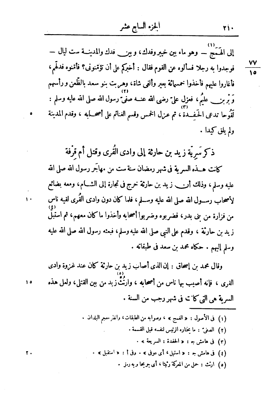 وقال محمد بن إسحاق: إن الذى أصاب زيد بن حارثة كان عند غزوة وادى القرى، فإنه أصيب بها ناس من أصحابه، وارتثّ «5» زيد من بين القتلى، ولعل هذه السرية هى التى كانت فى شهر رجب من السنة.