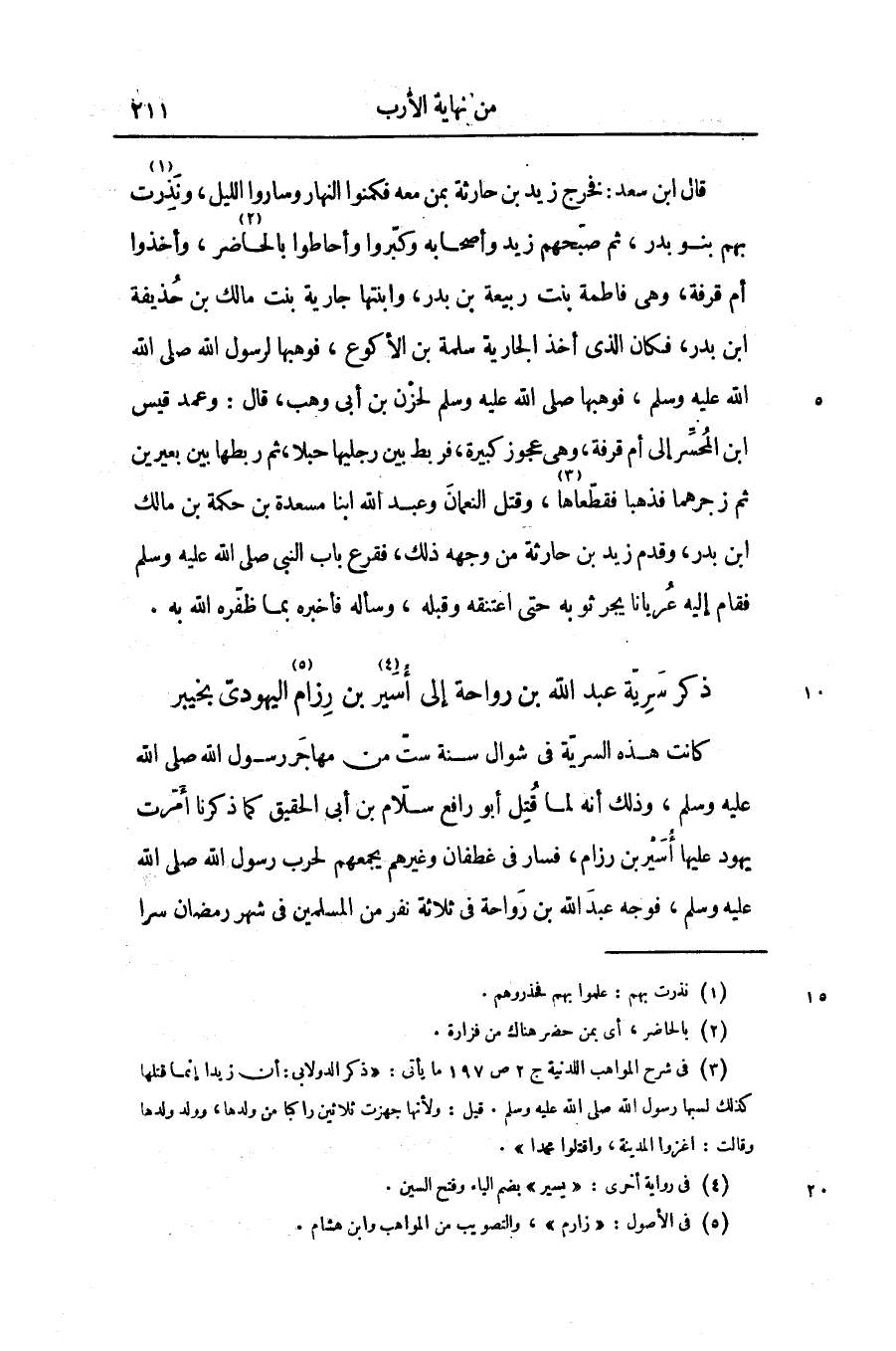 قال ابن سعد: فخرج زيد بن حارثة بمن معه فكمنوا النهار وساروا الليل، ونذرت «1» بهم بنو بدر، ثم صبّحهم زيد وأصحابه وكبّروا وأحاطوا بالحاضر «2» ، وأخذوا أم قرفة، وهى فاطمة بنت ربيعة بن بدر، وابنتها جارية بنت مالك بن حذيفة ابن بدر، فكان الذى أخذ الجارية سلمة بن الأكوع، فوهبها لرسول الله صلّى الله عليه وسلّم، فوهبها صلّى الله عليه وسلّم لحزن بن أبى وهب، قال: وعمد قيس ابن المحسّر إلى أم قرفة، وهى عجوز كبيرة، فربط بين رجليها حبلا، ثم ربطها بين بعيرين ثم زجرهما فذهبا فقطّعاها «3» ، وقتل النعمان وعبد الله ابنا مسعدة بن حكمة بن مالك ابن بدر، وقدم زيد بن حارثة من وجهه ذلك، فقرع باب النبى صلّى الله عليه وسلّم فقام إليه عريانا يجر ثوبه حتى اعتنقه وقبله، وسأله فأخبره بما ظفّره الله به.