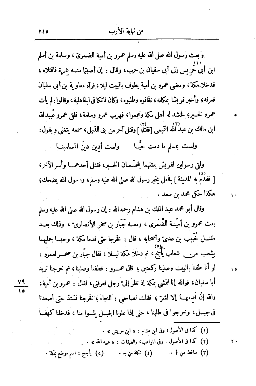وبعث رسول الله صلّى الله عليه وسلّم عمرو بن أمية الضمرىّ، وسلمة بن أسلم ابن أبى «1» حريس إلى أبى سفيان بن حرب، وقال: إن أصبتما منه غرة فاقتلاه؛ فدخلا مكة، ومضى عمرو بن أمية يطوف بالبيت ليلا، فرآه معاوية بن أبى سفيان فعرفه، وأخبر قريشا بمكانه، فخافوه وطلبوه، وكان فاتكا فى الجاهلية، وقالوا: لم يأت عمرو لخير؛ فحشد له أهل مكة وتجمعوا، فهرب عمرو وسلمة، فلقى عمرو عبيد الله ابن مالك بن عبد الله «2» التميمى [فقتله «3» ] وقتل آخرين من بنى الدّيل، سمعه يتغنى ويقول: