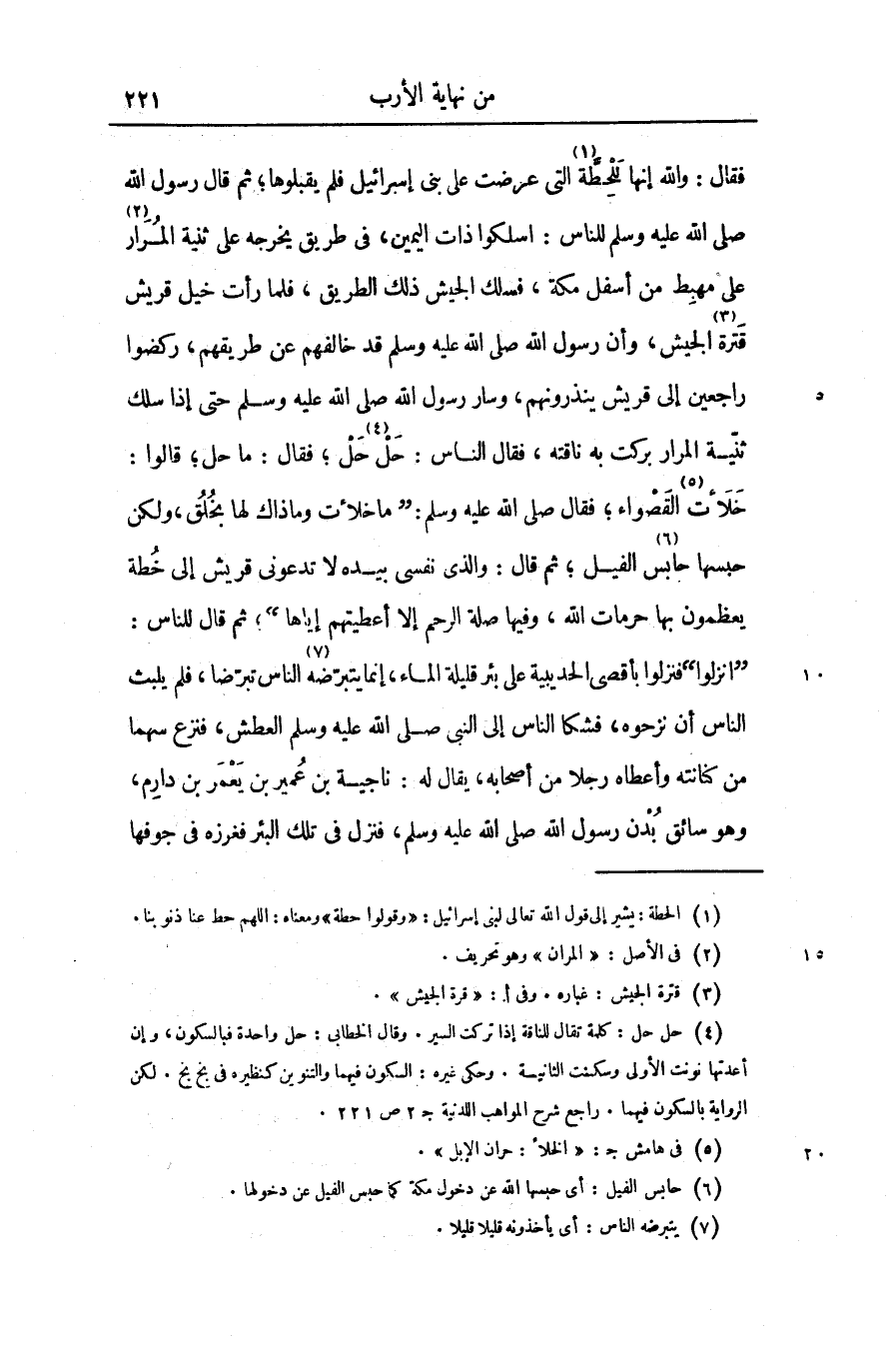 خلأت «5» القصواء؛ فقال صلّى الله عليه وسلّم: «ما خلأت وما ذاك لها بخلق، ولكن حبسها حابس «6» الفيل؛ ثم قال: والذى نفسى بيده لا تدعونى قريش إلى خطة يعظمون بها حرمات الله، وفيها صلة الرحم إلا أعطيتهم إياها» ؛ ثم قال للناس: