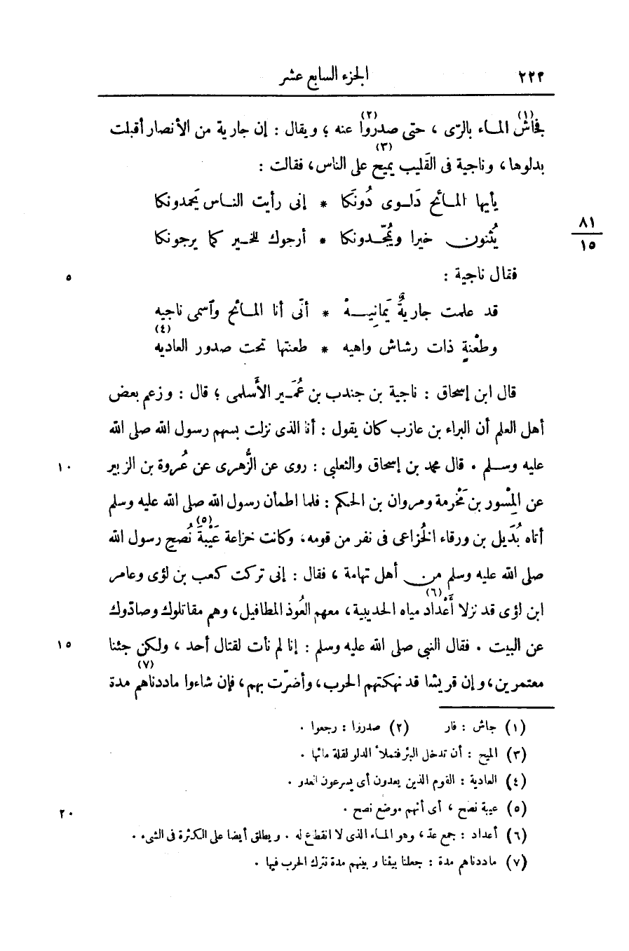 فجاش «1» الماء بالرّى، حتى صدروا «2» عنه؛ ويقال: إن جارية من الأنصار أقبلت بدلوها، وناجية فى القليب يميح «3» على الناس، فقالت:
