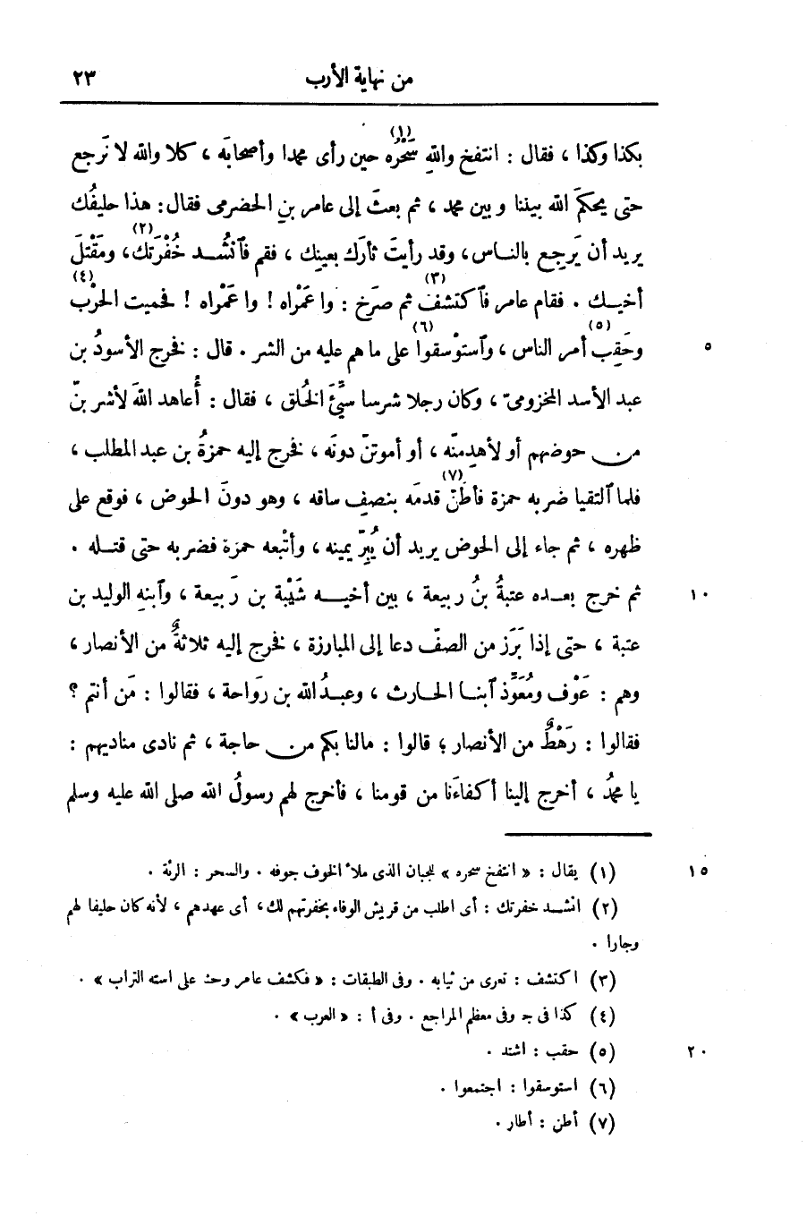 بكذا وكذا، فقال: انتفخ والله سحره «1» حين رأى محمدا وأصحابه، كلا والله لا نرجع حتى يحكم الله بيننا وبين محمد، ثم بعث إلى عامر بن الحضرمى فقال: هذا حليفك يريد أن يرجع بالناس، وقد رأيت ثارك بعينك، فقم فأنشد خفرتك «2» ومقتل أخيك. فقام عامر فاكتشف «3» ثم صرخ: واعمراه! وا عمراه! فحميت الحرب»