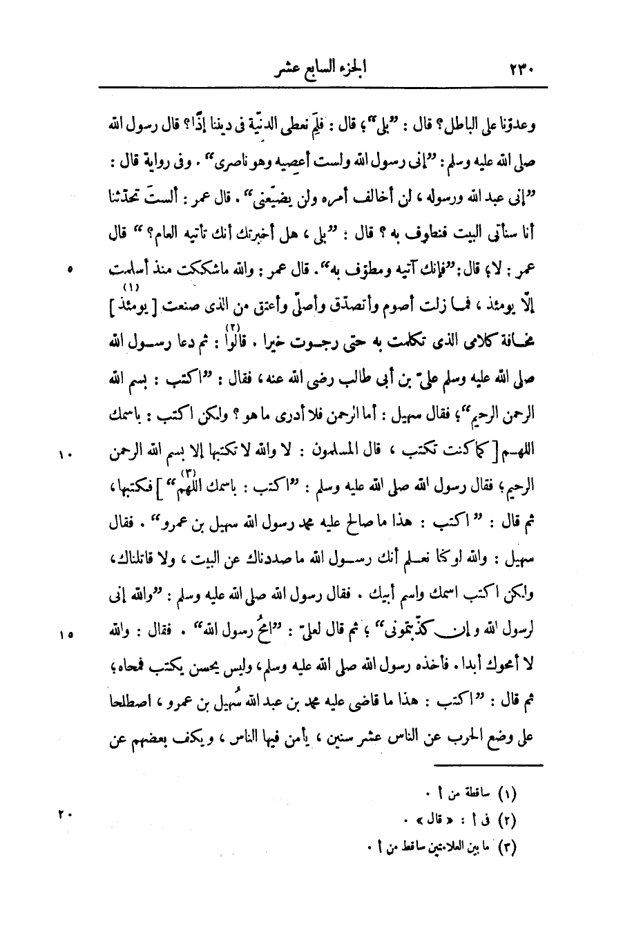 «إنى عبد الله ورسوله، لن أخالف أمره ولن يضيّعنى» . قال عمر: ألست تحدّثنا أنا سنأتى البيت فنطوف به؟ قال: «بلى، هل أخبرتك أنك تأتيه العام؟» قال عمر: لا؛ قال: «فإنك آتيه ومطوّف به» . قال عمر: والله ما شككت منذ أسلمت إلّا يومئذ، فما زلت أصوم وأتصدّق وأصلّى وأعتق من الذى صنعت [يومئذ «1» ] مخافة كلامى الذى تكلمت به حتى رجوت خيرا. قالوا «2» : ثم دعا رسول الله صلّى الله عليه وسلّم علىّ بن أبى طالب رضى الله عنه، فقال: «اكتب: بسم الله الرحمن الرحيم» ؛ فقال سهيل: أما الرحمن فلا أدرى ما هو؟ ولكن اكتب: باسمك اللهم [كما كنت تكتب، قال المسلمون: لا والله لا تكتبها إلا بسم الله الرحمن الرحيم؛ فقال رسول الله صلّى الله عليه وسلّم: «اكتب: باسمك اللهم «3» » ] فكتبها، ثم قال: «اكتب: هذا ما صالح عليه محمد رسول الله سهيل بن عمرو» . فقال سهيل: والله لو كنا نعلم أنك رسول الله ما صددناك عن البيت، ولا قاتلناك، ولكن اكتب اسمك واسم أبيك. فقال رسول الله صلّى الله عليه وسلّم: «والله إنى لرسول الله وإن كذّبتمونى» ؛ ثم قال لعلىّ: «امح رسول الله» . فقال: والله لا أمحوك أبدا. فأخذه رسول الله صلّى الله عليه وسلّم، وليس يحسن يكتب فمحاه؛ ثم قال: «اكتب: هذا ما قاضى عليه محمد بن عبد الله سهيل بن عمرو، اصطلحا على وضع الحرب عن الناس عشر سنين، يأمن فيها الناس، ويكف بعضهم عن