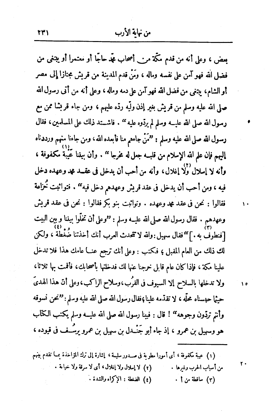 بعض، وعلى أنه من قدم مكّة من أصحاب محمّد حاجّا أو معتمرا أو يبتغى من فضل الله فهو آمن على نفسه وماله، ومن قدم المدينة من قريش مجتازا إلى مصر أو الشام، يبتغى من فضل الله فهو آمن على دمه وماله، وعلى أنه من أتى رسول الله صلّى الله عليه وسلّم من قريش بغير إذن وليّه ردّه عليهم، ومن جاء قريشا ممن مع رسول الله صلّى الله عليه وسلّم لم يردّوه عليه» . فاشتد ذلك على المسلمين، فقال رسول الله صلّى الله عليه وسلّم: «من جاءهم منا فأبعده الله، ومن جاءنا منهم ورددناه إليهم فإن علم الله الإسلام من قلبه جعل له مخرجا» . وأن بيننا عيبة «1» مكفوفة، وأنه لا إسلال «2» ولا إغلال، وأنه من أحب أن يدخل فى عقد محمد وعهده دخل فيه، ومن أحب أن يدخل فى عقد قريش وعهدهم دخل فيه» . فتواثبت خزاعة فقالوا: نحن فى عقد محمد وعهده. وتواثبت بنو بكر فقالوا: نحن فى عقد قريش وعهدهم. فقال رسول الله صلّى الله عليه وسلّم: «وعلى أن تخلّوا بيننا وبين البيت [فنطوف «3» به.] » فقال سهيل: والله لا تتحدث العرب أنك أخذتنا ضغطة «4» ، ولكن لك ذلك من العام المقبل؛ فكتب: وعلى أنك ترجع عنا عامك هذا فلا تدخل علينا مكة، فإذا كان عام قابل خرجنا عنها لك فدخلتها بأصحابك، فأقمت بها ثلاثا، ولا تدخلها بالسلاح إلا السيوف فى القرب، وسلاح الراكب، وعلى أنّ هذا الهدى حيثما حبسناه محلّه، لا تقدّمه علينا؛ فقال رسول الله صلّى الله عليه وسلّم: «نحن نسوقه وأنتم تردّون وجوهه» ! قال: فبينا رسول الله صلّى الله عليه وسلّم يكتب الكتاب هو وسهيل بن عمرو، إذ جاء أبو جندل بن سهيل بن عمرو يوسف فى قيوده،