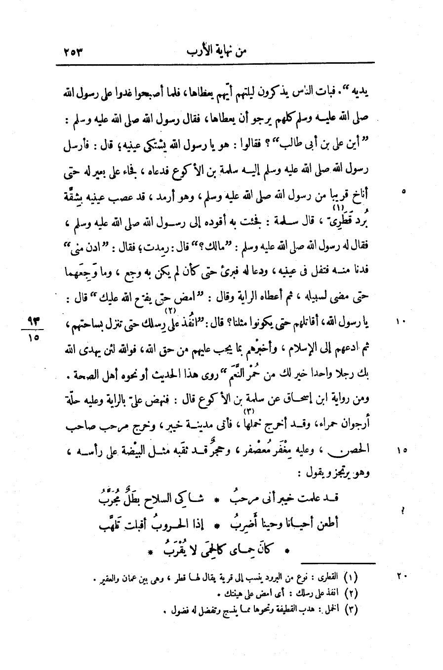 ومن رواية ابن إسحاق عن سلمة بن الأكوع قال: فنهض علىّ بالراية وعليه حلّة أرجوان حمراء، وقد أخرج خملها «3» ، فأتى مدينة خيبر، وخرج مرحب صاحب الحصن، وعليه مغفر معصفر، وحجر قد ثقبه مثل البيضة على رأسه، وهو يرتجز ويقول: