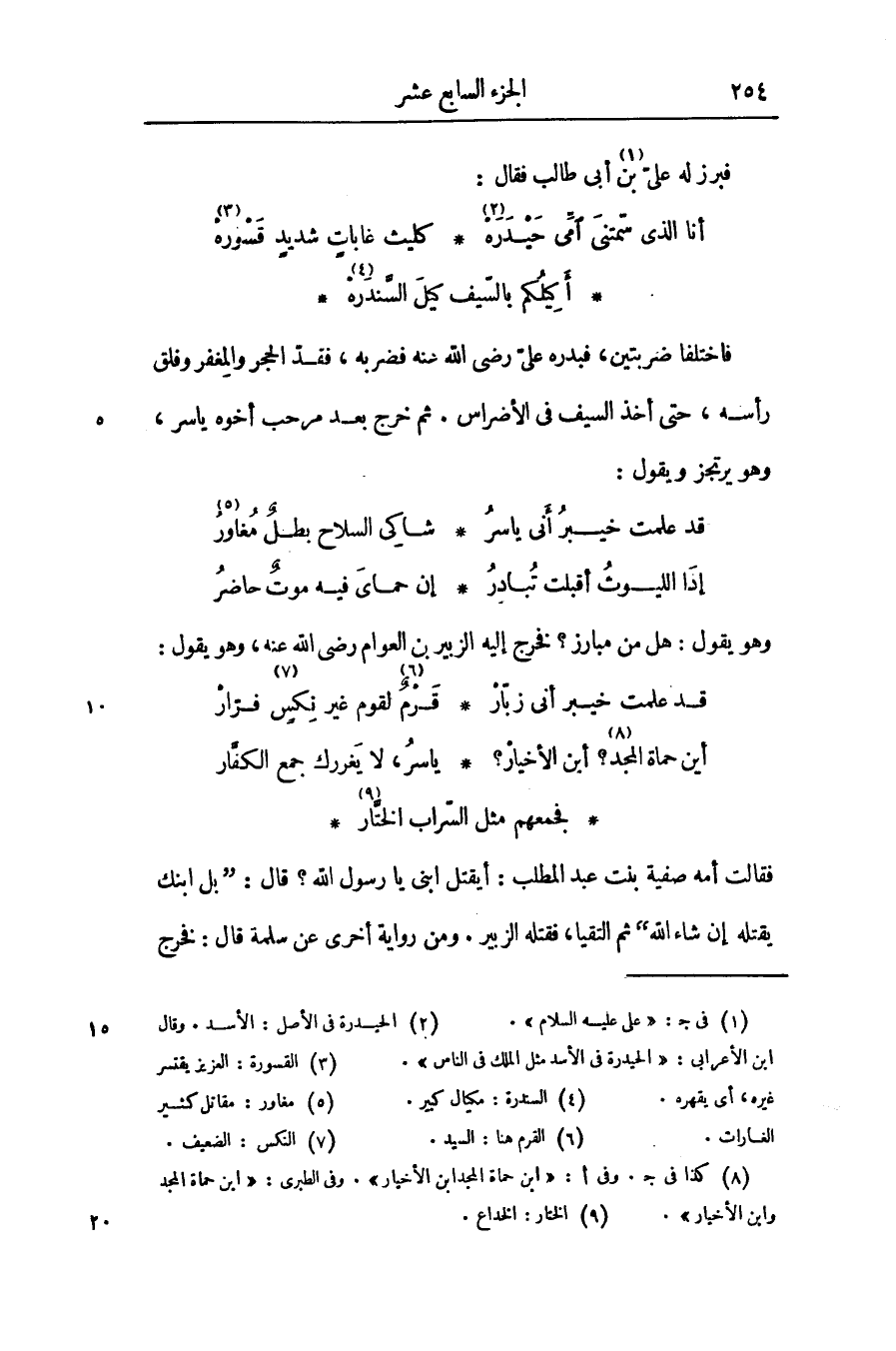 فاختلفا ضربتين، فبدره علىّ رضى الله عنه فضربه، فقدّ الحجر والمغفر وفلق رأسه، حتى أخذ السيف فى الأضراس. ثم خرج بعد مرحب أخوه ياسر، وهو يرتجز ويقول: