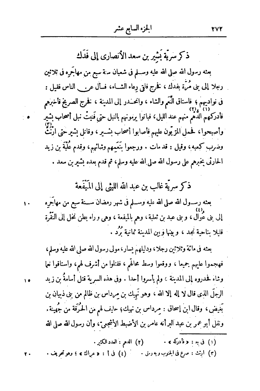 فى نواديهم، فاستاق النّعم والشاء، وانحدر إلى المدينة، فخرج الصريخ فأخبرهم فأدركهم «1» الدّهم «2» منهم عند الليل، فباتوا يرمونهم بالنبل حتى فنيت نبل أصحاب بشير وأصبحوا، فحمل المرّبون عليهم فأصابوا أصحاب بشير، وقاتل بشير حتى ارتثّ «3» وضرب كعبه، وقيل: قد مات. ورجعوا بنعمهم وشائهم، وقدم علبة بن زيد الحارثى يخبرهم على رسول الله صلّى الله عليه وسلّم، ثم قدم بعده بشير بن سعد.