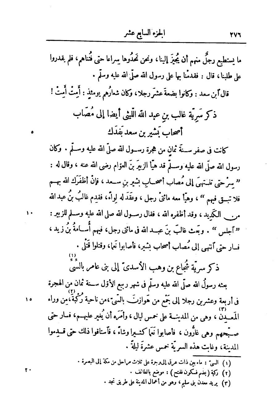 «اجلس» . وبعث غالب بن عبد الله فى مائتى رجل، فيهم أسامة بن زيد، فسار حتى انتهى إلى مصاب أصحاب بشير، فأصابوا نعما، وقتلوا قتلى.