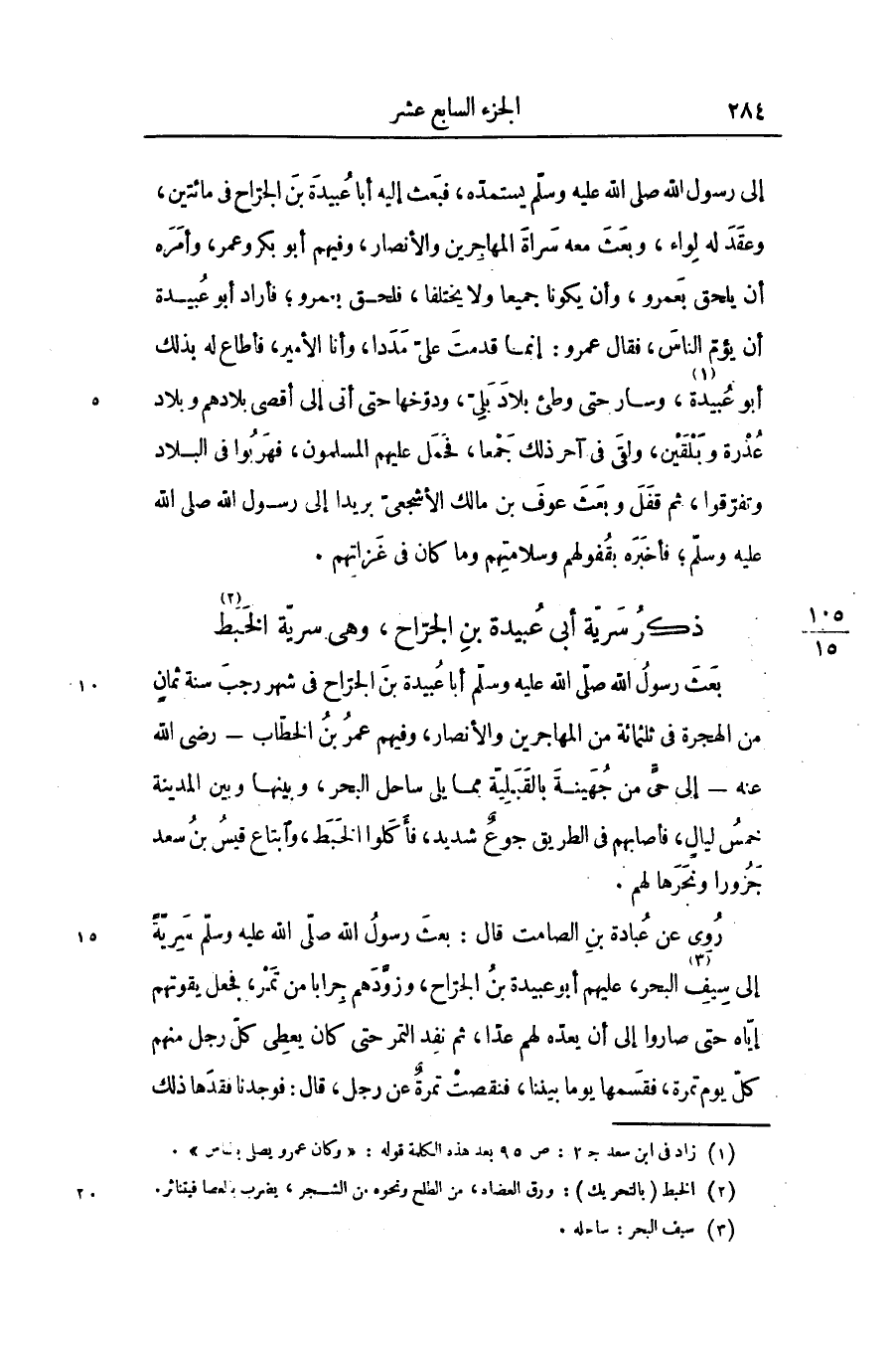 بعث رسول الله صلّى الله عليه وسلّم أبا عبيدة بن الجرّاح فى شهر رجب سنة ثمان من الهجرة فى ثلاثمائة من المهاجرين والأنصار، وفيهم عمر بن الخطّاب- رضى الله عنه- إلى حىّ من جهينة بالقبليّة مما يلى ساحل البحر، وبينها وبين المدينة خمس ليال، فأصابهم فى الطريق جوع شديد، فأكلوا الخبط، وابتاع قيس بن سعد جزورا ونحرها لهم.