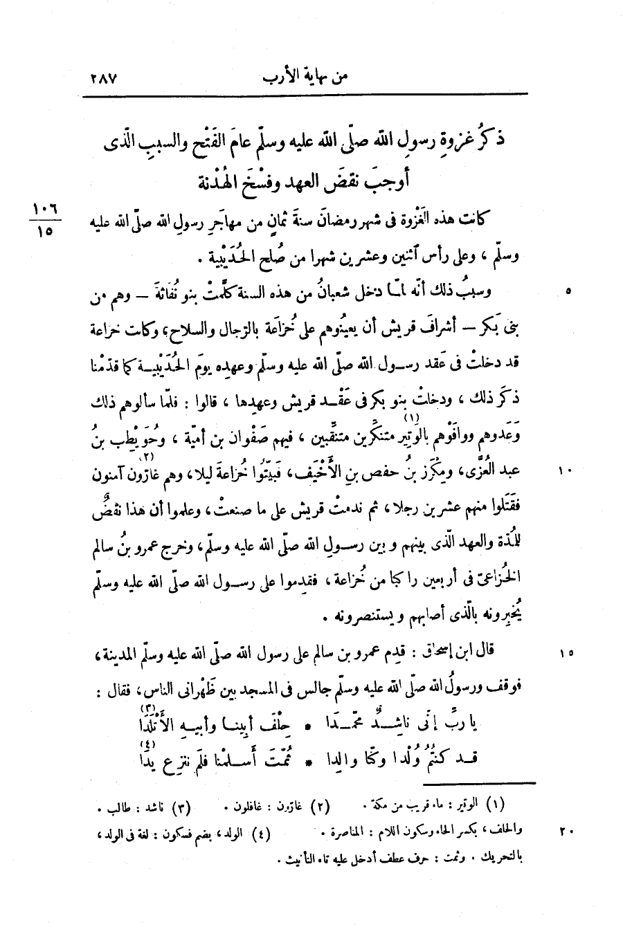 وسبب ذلك أنّه لمّا دخل شعبان من هذه السنة كلّمت بنو نفاثة- وهم من بنى بكر- أشراف قريش أن يعينوهم على خزاعة بالرّجال والسلاح، وكانت خزاعة قد دخلت فى عقد رسول الله صلّى الله عليه وسلّم وعهده يوم الحديبية كما قدّمنا ذكر ذلك، ودخلت بنو بكر فى عقد قريش وعهدها، قالوا: فلمّا سألوهم ذلك وعدوهم ووافوهم بالوتير «1» متنكّرين متنقّبين، فيهم صفوان بن أميّة، وحويطب بن عبد العزّى، ومكرز بن حفص بن الأخيف، فبيّتوا خزاعة ليلا، وهم غارّون «2» آمنون فقتلوا منهم عشرين رجلا، ثم ندمت قريش على ما صنعت، وعلموا أن هذا نقض للمدّة والعهد الّذى بينهم وبين رسول الله صلّى الله عليه وسلّم، وخرج عمرو بن سالم الخزاعىّ فى أربعين راكبا من خزاعة، فقدموا على رسول الله صلّى الله عليه وسلّم يخبرونه بالّذى أصابهم ويستنصرونه.