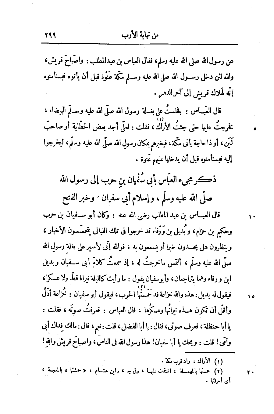 قال العبّاس: فجلست على بغلة رسول الله صلّى الله عليه وسلّم البيضاء، فخرجت عليها حتى جئت الأراك «1» ، فقلت: لعلّى أجد بعض الحطّابة أو صاحب لبن، أو ذا حاجة يأتى مكّة، فيخبرهم بمكان رسول الله صلّى الله عليه وسلّم، ليخرجوا إليه فيستأمنوه قبل أن يدخلها عليهم عنوة.