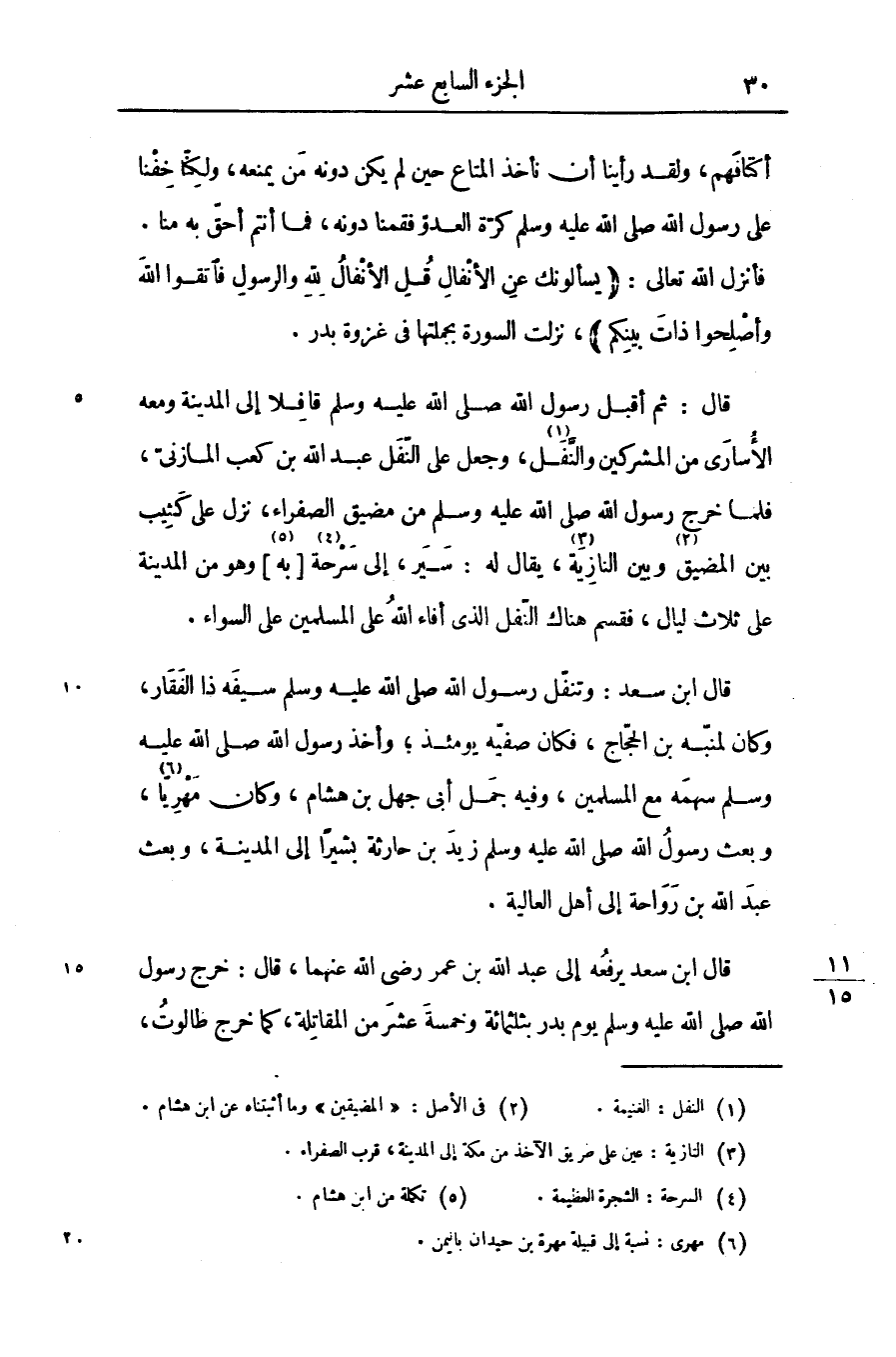 قال: ثم أقبل رسول الله صلّى الله عليه وسلّم قافلا إلى المدينة ومعه الأسارى من المشركين والنّفل «1» ، وجعل على النّفل عبد الله بن كعب المازنىّ، فلما خرج رسول الله صلّى الله عليه وسلّم من مضيق الصفراء، نزل على كثيب بين المضيق «2» وبين النازية «3» ، يقال له: سير، إلى سرحة «4» [به «5» ] وهو من المدينة على ثلاث ليال، فقسم هناك النّفل الذى أفاء الله على المسلمين على السواء.