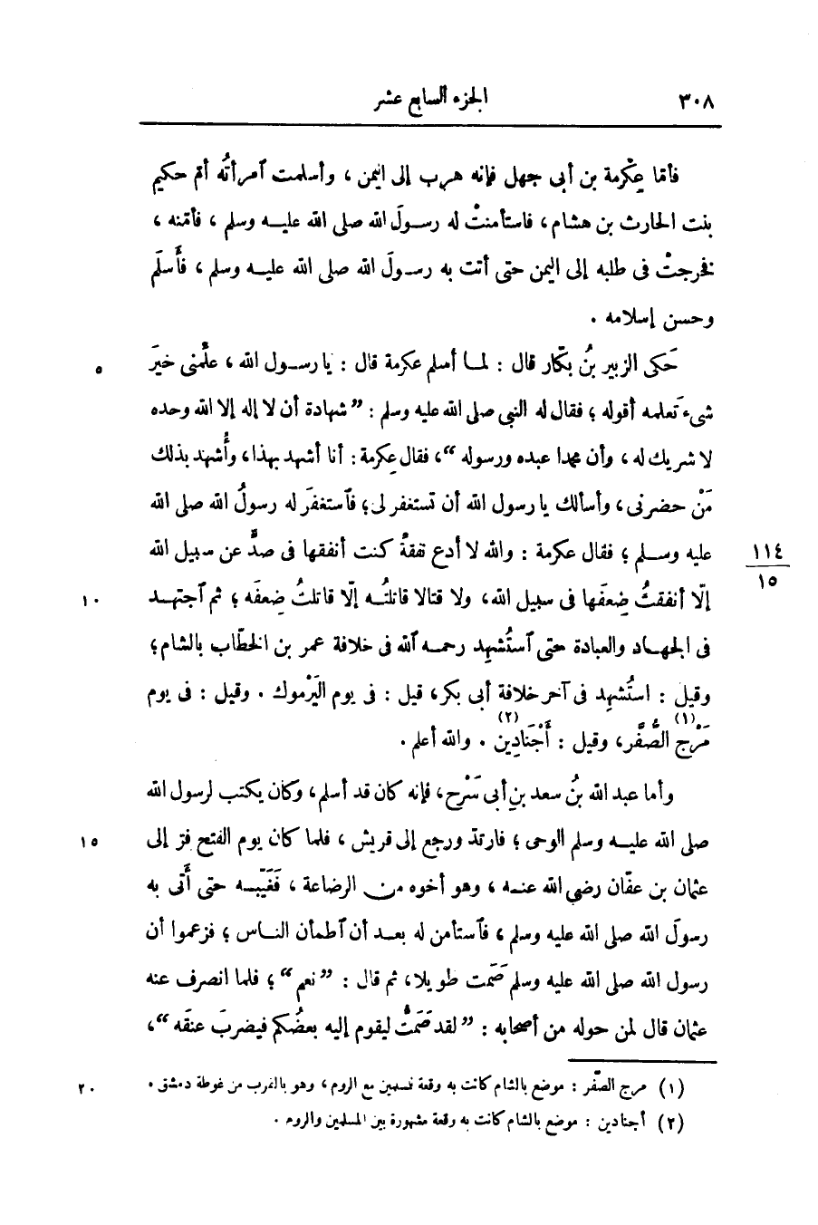 حكى الزبير بن بكّار قال: لما أسلم عكرمة قال: يا رسول الله، علّمنى خير شىء تعلمه أقواله؛ فقال له النبى صلّى الله عليه وسلّم: «شهادة أن لا إله إلا الله وحده لا شريك له، وأن محمدا عبده ورسوله» ، فقال عكرمة: أنا أشهد بهذا، وأشهد بذلك من حضرنى، وأسألك يا رسول الله أن تستغفر لى؛ فاستغفر له رسول الله صلّى الله عليه وسلّم؛ فقال عكرمة: والله لا أدع نفقة كنت أنفقها فى صدّ عن سبيل الله إلّا أنفقت ضعفها فى سبيل الله، ولا قتالا قاتلته إلّا قاتلت ضعفه؛ ثم اجتهد فى الجهاد والعبادة حتى استشهد رحمه الله فى خلافة عمر بن الخطّاب بالشام؛ وقيل: استشهد فى آخر خلافة أبى بكر، قيل: فى يوم اليرموك. وقيل: فى يوم مرج «1» الصّفّر، وقيل: أجنادين «2» . والله أعلم.