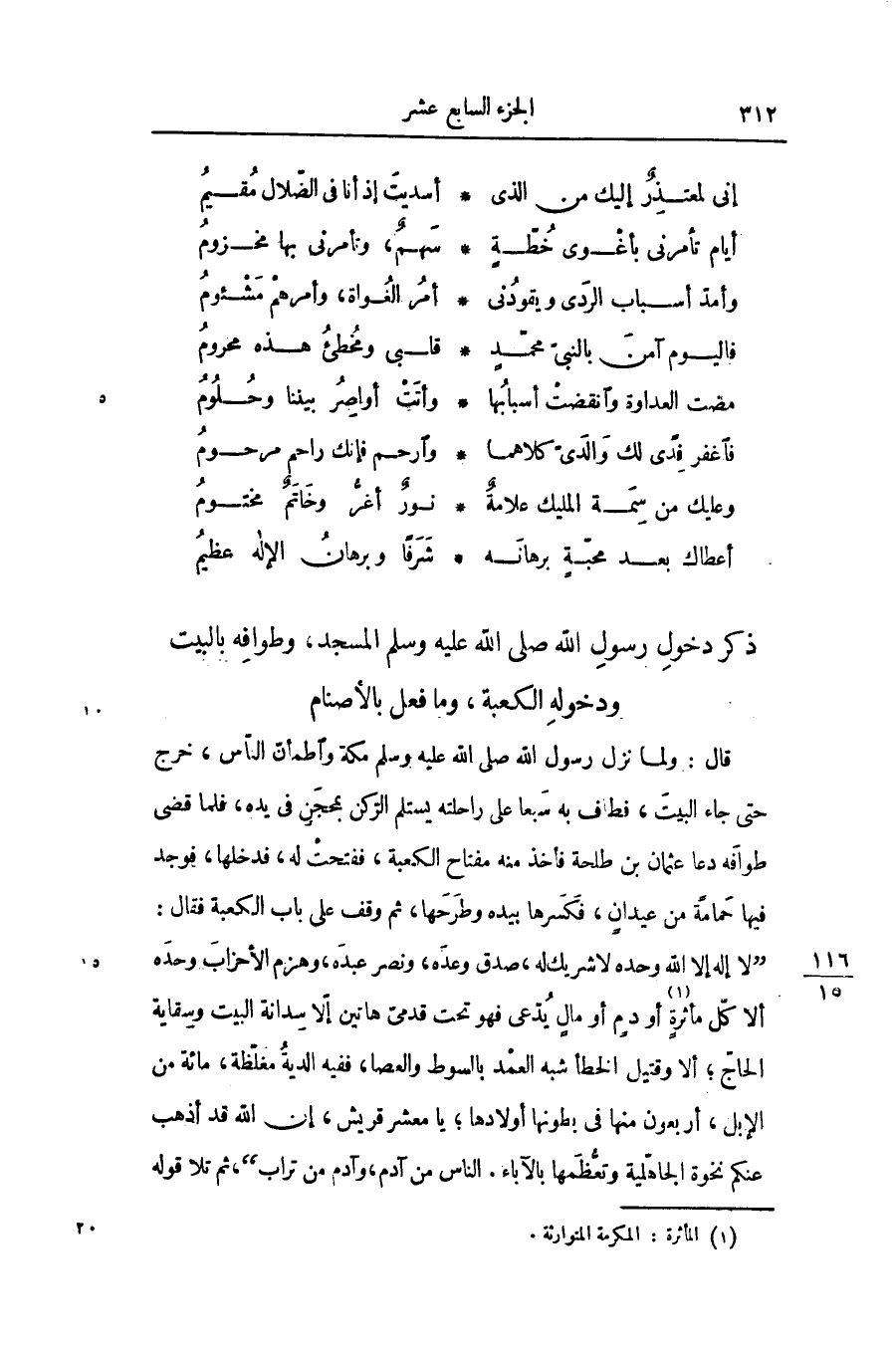 «لا إله إلا الله وحده لا شريك له، صدق وعده، ونصر عبده، وهزم الأحزاب وحده ألا كلّ مأثره «1» أو دم أو مال يدّعى فهو تحت قدمىّ هاتين إلّا سدانة البيت وسقاية الحاجّ؛ ألا وقتيل الخطأ شبه العمد بالسوط والعصا، ففيه الدية مغلّظة، مائة من الإبل، أربعون منها فى بطونها أولادها؛ يا معشر قريش، إن الله قد أذهب عنكم نخوة الجاهليّة وتعظّمها بالآباء. الناس من آدم، وآدم من تراب» ، ثم تلا قوله