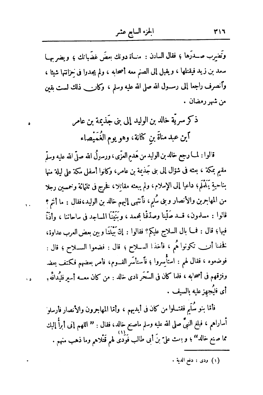 فأمّا بنو سليم فقتلوا من كان فى أيديهم، وأمّا المهاجرون والأنصار فأرسلوا أساراهم، فبلغ النبىّ صلّى الله عليه وسلّم ما صنع خالد، فقال: «اللهم إنى أبرأ إليك مما صنع خالد» ؛ وبعث علىّ بن أبى طالب فودى «1» لهم قتلاهم وما ذهب منهم.