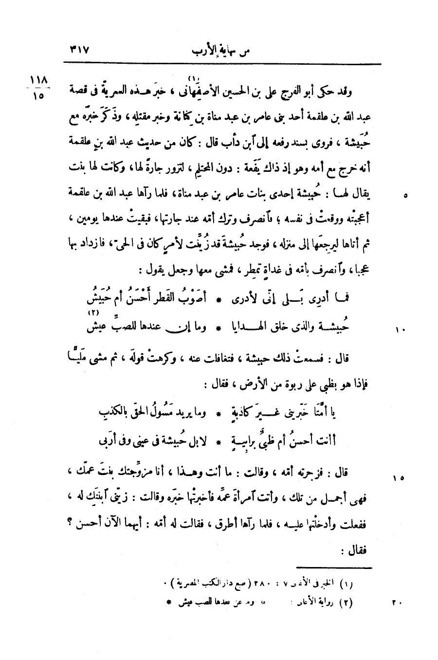 وقد حكى أبو الفرج على بن الحسين الأصفهانى «1» ، خبر هذه السريّة فى قصة عبد الله بن علقمة أحد بنى عامر بن عبد مناة بن كنانة وخبر مقتله، وذكر خبره مع حبيشة، فروى بسند رفعه إلى ابن دأب قال: كان من حديث عبد الله بن علقمة أنه خرج مع أمه وهو إذ ذاك يفعة: دون المحتلم، لتزور جارة لها، وكانت لها بنت يقال لها: حبيشة إحدى بنات عامر بن عبد مناة، فلما رآها عبد الله بن علقمة أعجبته ووقعت فى نفسه؛ فانصرف وترك أمّه عند جارتها، فبقيت عندها يومين، ثم أتاها ليرجعها إلى منزله، فوجد حبيشة قد زيّنت لأمر كان فى الحىّ، فازداد بها عجبا، وانصرف بأمّه فى غداة تمطر، فمشى معها وجعل يقول: