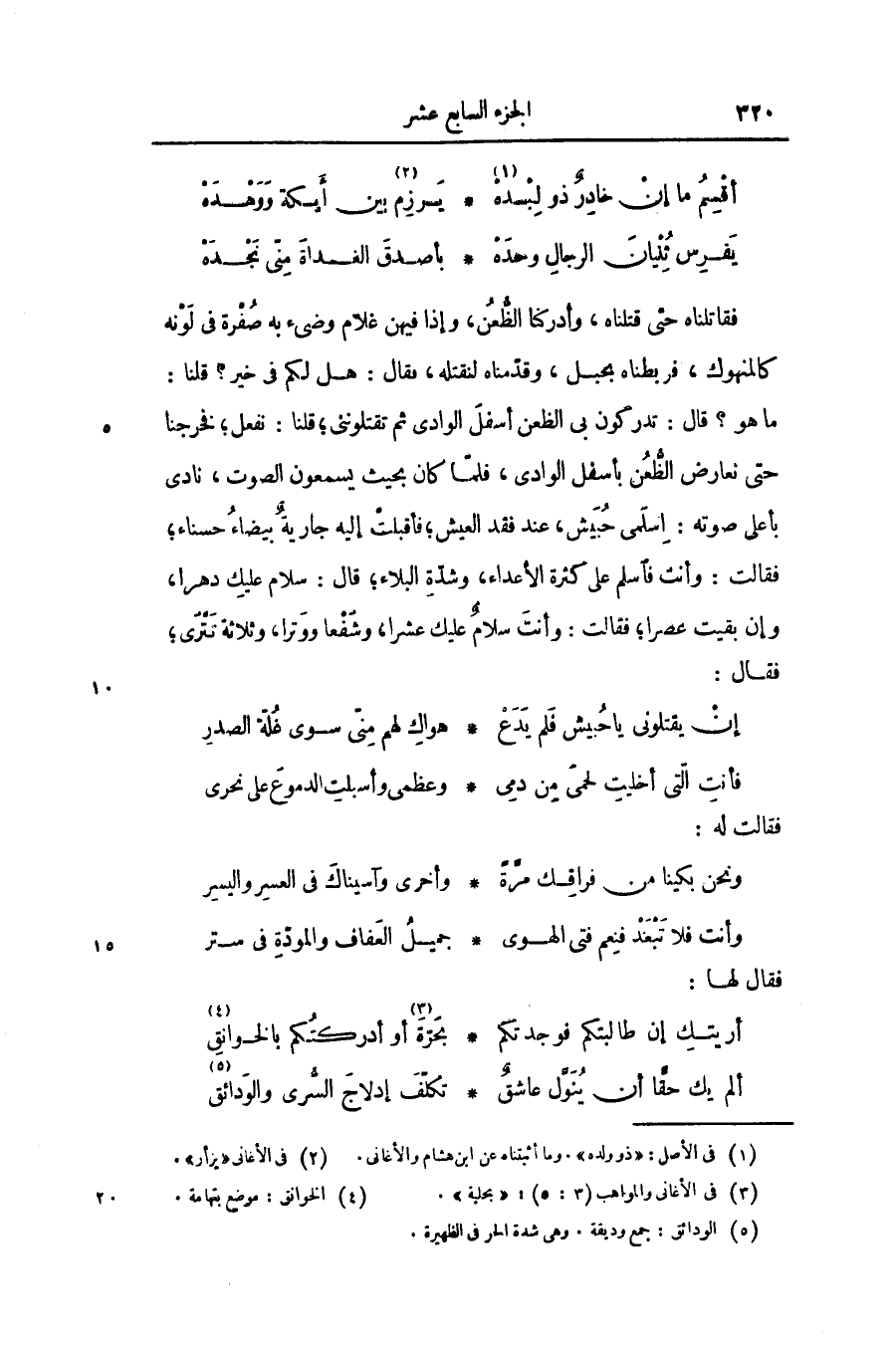 ما هو؟ قال: تدركون بى الظعن أسفل الوادى ثم تقتلوننى؛ قلنا: نفعل؛ فخرجنا حتى نعارض الظّعن بأسفل الوادى، فلمّا كان بحيث يسمعون الصوت، نادى بأعلى صوته: اسلمى حبيش، عند فقد العيش؛ فأقبلت إليه جارية بيضاء حسناء؛ فقالت: وأنت فأسلم على كثرة الأعداء، وشدّة البلاء؛ قال: سلام عليك دهرا، وإن بقيت عصرا؛ فقالت: وأنت سلام عليك عشرا، وشفعا ووترا، وثلاثة تترى؛ فقال: