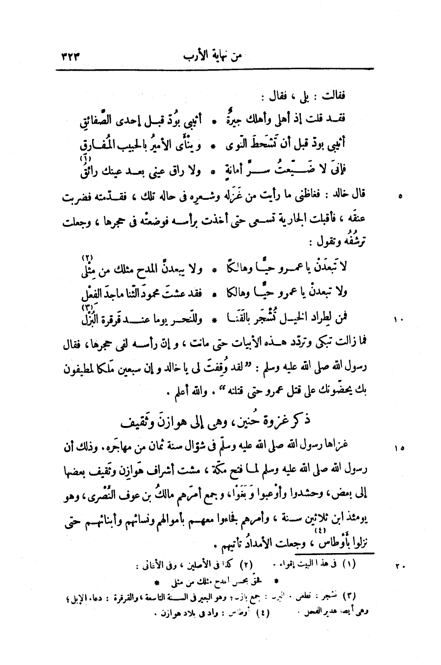 فما زالت تبكى وتردّد هذه الأبيات حتى ماتت، وإنّ رأسه لفى حجرها، فقال رسول الله صلّى الله عليه وسلّم: «لقد وقفت لى يا خالد وإن سبعين ملكا لمطيفون بك يحضّونك على قتل عمرو حتى قتلته» . والله أعلم.