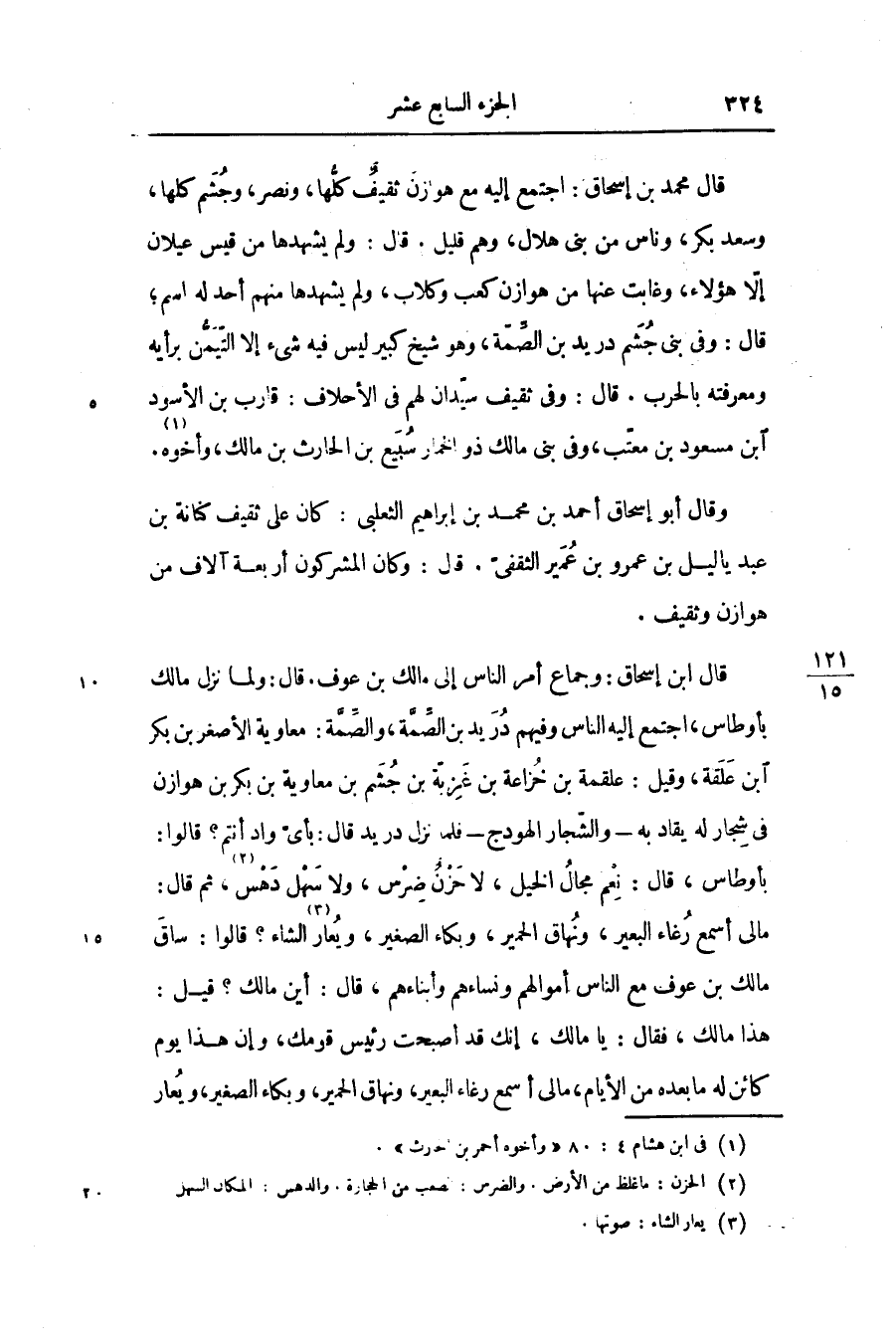 قال محمد بن إسحاق: اجتمع إليه مع هوازن ثقيف كلّها، ونصر، وجشم كلها، وسعد بكر، وناس من بنى هلال، وهم قليل. قال: ولم يشهدها من قيس عيلان إلّا هؤلاء، وغابت عنها من هوازن كعب وكلاب، ولم يشهدها منهم أحد له اسم؛ قال: وفى بنى جشم دريد بن الصّمّة، وهو شيخ كبير ليس فيه شىء إلا التّيمّن برأيه ومعرفته بالحرب. قال: وفى ثقيف سيّدان لهم فى الأحلاف: قارب بن الأسود ابن مسعود بن معتّب، وفى بنى مالك ذو الخمار سبيع بن الحارث بن مالك، وأخوه «1» .
