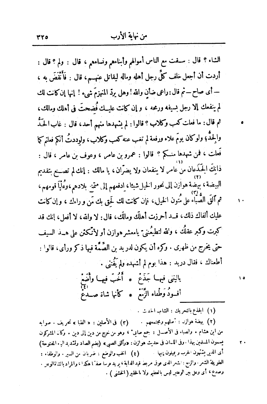 أردت أن أجعل خلف كلّ رجل أهله وماله ليقاتل عنهم، قال: فأنقض به،- أى صاح- ثم قال: راعى ضأن والله! وهل يردّ المنهزم شىء! إنها إن كانت لك لم ينفعك إلا رجل بسيفه ورمحه، وإن كانت عليك فضحت فى أهلك ومالك، ثم قال: ما فعلت كعب وكلاب؟ قالوا: لم يشهدها منهم أحد، قال: غاب الحدّ والجدّ؛ ولو كان يوم علاء ورفعة لم تغب عنه كعب وكلاب، ولوددت أنكم فعلتم كما فعلت، فمن شهدها منكم؟ قالوا: عمرو بن عامر، وعوف بن عامر، قال: