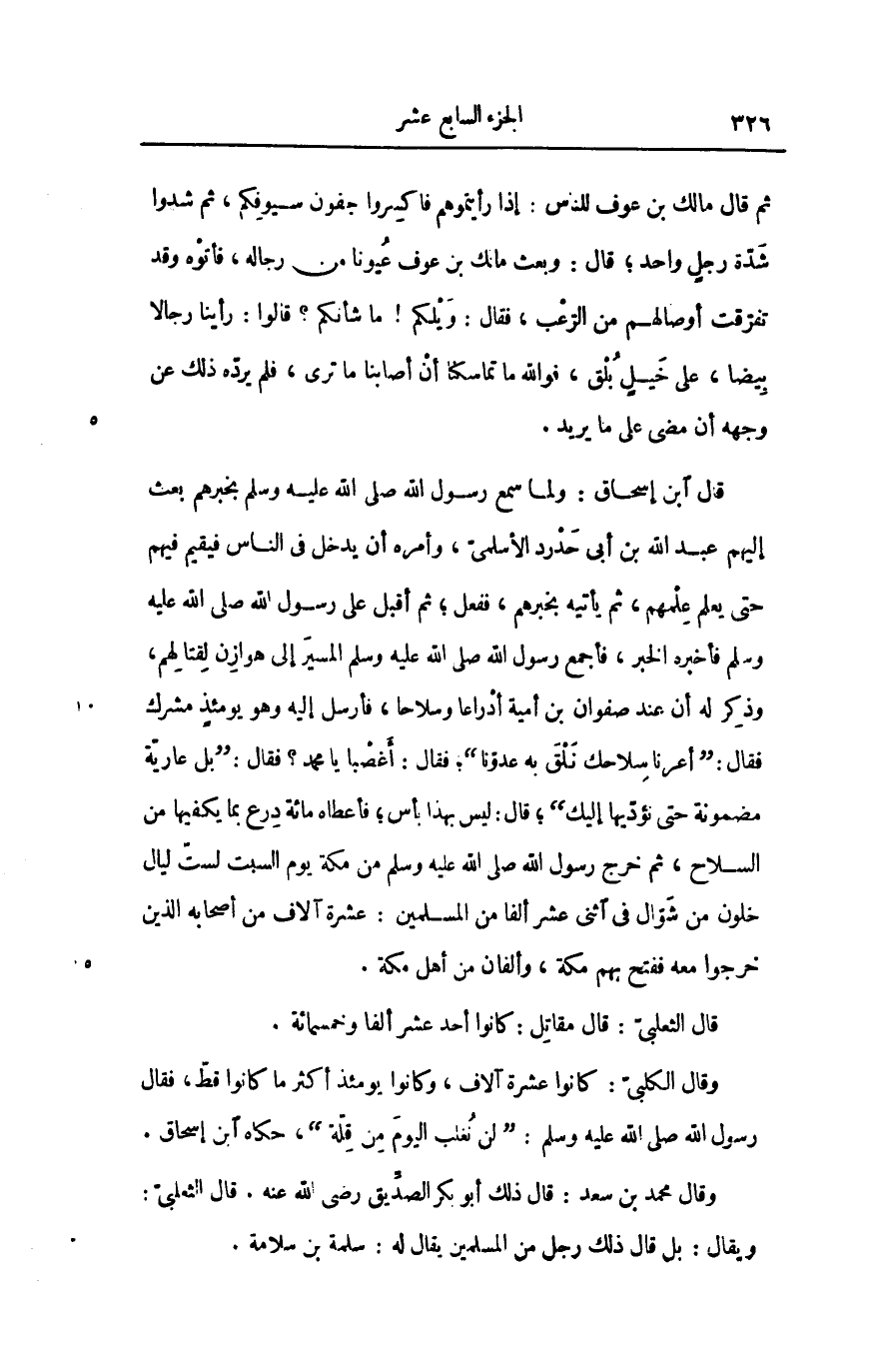 وقال الكلبىّ: كانوا عشرة آلاف، وكانوا يومئذ أكثر ما كانوا قطّ، فقال رسول الله صلّى الله عليه وسلّم: «لن نغلب اليوم من قلّة» ، حكاه ابن إسحاق.