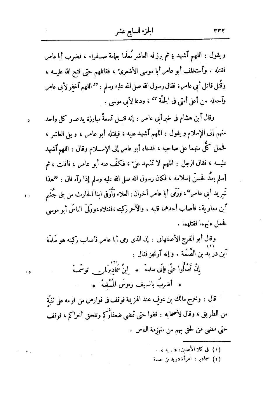 ويقول: اللهم اشهد؛ ثم برز له العاشر معلما بعمامة صفراء، فضرب أبا عامر فقتله. واستخلف أبو عامر أبا موسى الأشعرىّ، فقاتلهم حتى فتح الله عليه، وقتل قاتل أبى عامر، فقال رسول الله صلّى الله عليه وسلّم: «اللهم اغفر لأبى عامر واجعله من أعلى أمتى فى الجنّة» ، ودعا لأبى موسى.