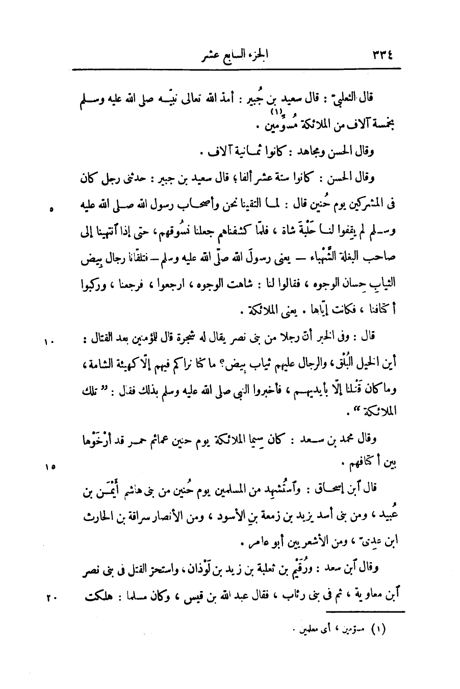 وقال الحسن: كانوا ستة عشر ألفا؛ قال سعيد بن جبير: حدثنى رجل كان فى المشركين يوم حنين قال: لما التقينا نحن وأصحاب رسول الله صلّى الله عليه وسلّم لم يقفوا لنا حلبة شاة، فلمّا كشفناهم جعلنا نسوقهم، حتى إذا انتهينا إلى صاحب البغلة الشّهباء- يعنى رسول الله صلّى الله عليه وسلّم- فتلقّانا رجال بيض الثياب حسان الوجوه، فقالوا لنا: شاهت الوجوه، ارجعوا، فرجعنا، وركبوا أكتافنا، فكانت إيّاها. يعنى الملائكة.