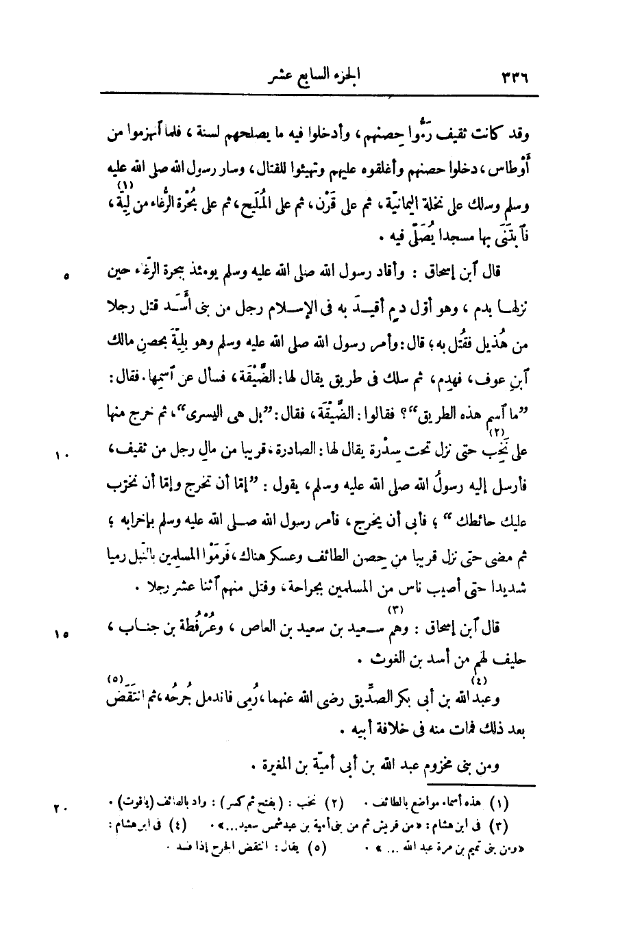 «ما اسم هذه الطريق» ؟ فقالوا: الضّيقة، فقال: «بل هى اليسرى» ، ثم خرج منها على نخب «2» حتى نزل تحت سدرة يقال لها: الصادرة، قريبا من مال رجل من ثقيف، فأرسل إليه رسول الله صلّى الله عليه وسلّم، يقول: «إمّا أن تخرج وإمّا أن نخرّب عليك حائطك» ؛ فأبى أن يخرج، فأمر رسول الله صلّى الله عليه وسلّم بإخرابه؛ ثم مضى حتى نزل قريبا من حصن الطائف وعسكر هناك، فرموا المسلمين بالنّبل رميا شديدا حتى أصيب ناس من المسلمين بجراحة، وقتل منهم اثنا عشر رجلا.