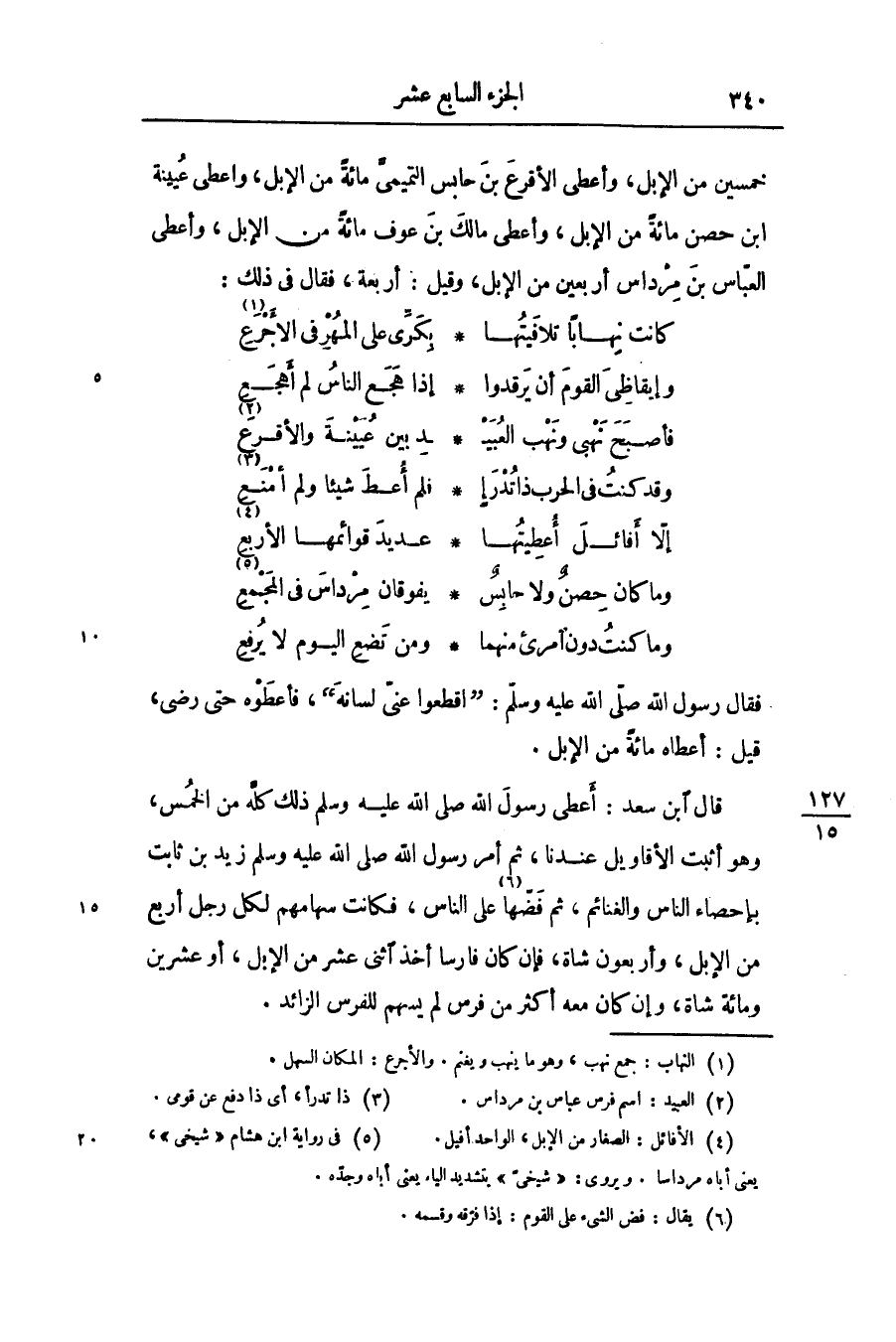 خمسين من الإبل، وأعطى الأقرع بن حابس التميمىّ مائة من الإبل، واعطى عيينة ابن حصن مائة من الإبل، وأعطى مالك بن عوف مائة من الإبل، وأعطى العبّاس بن مرداس أربعين من الإبل، وقيل: أربعة، فقال فى ذلك: