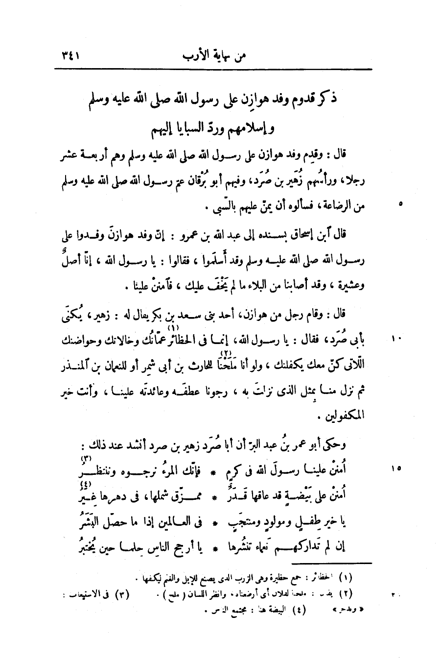 قال ابن إسحاق بسنده إلى عبد الله بن عمرو: إنّ وفد هوازن وفدوا على رسول الله صلّى الله عليه وسلّم وقد أسلموا، فقالوا: يا رسول الله، إنّا أصل وعشيرة، وقد أصابنا من البلاء ما لم يخف عليك، فامنن علينا.