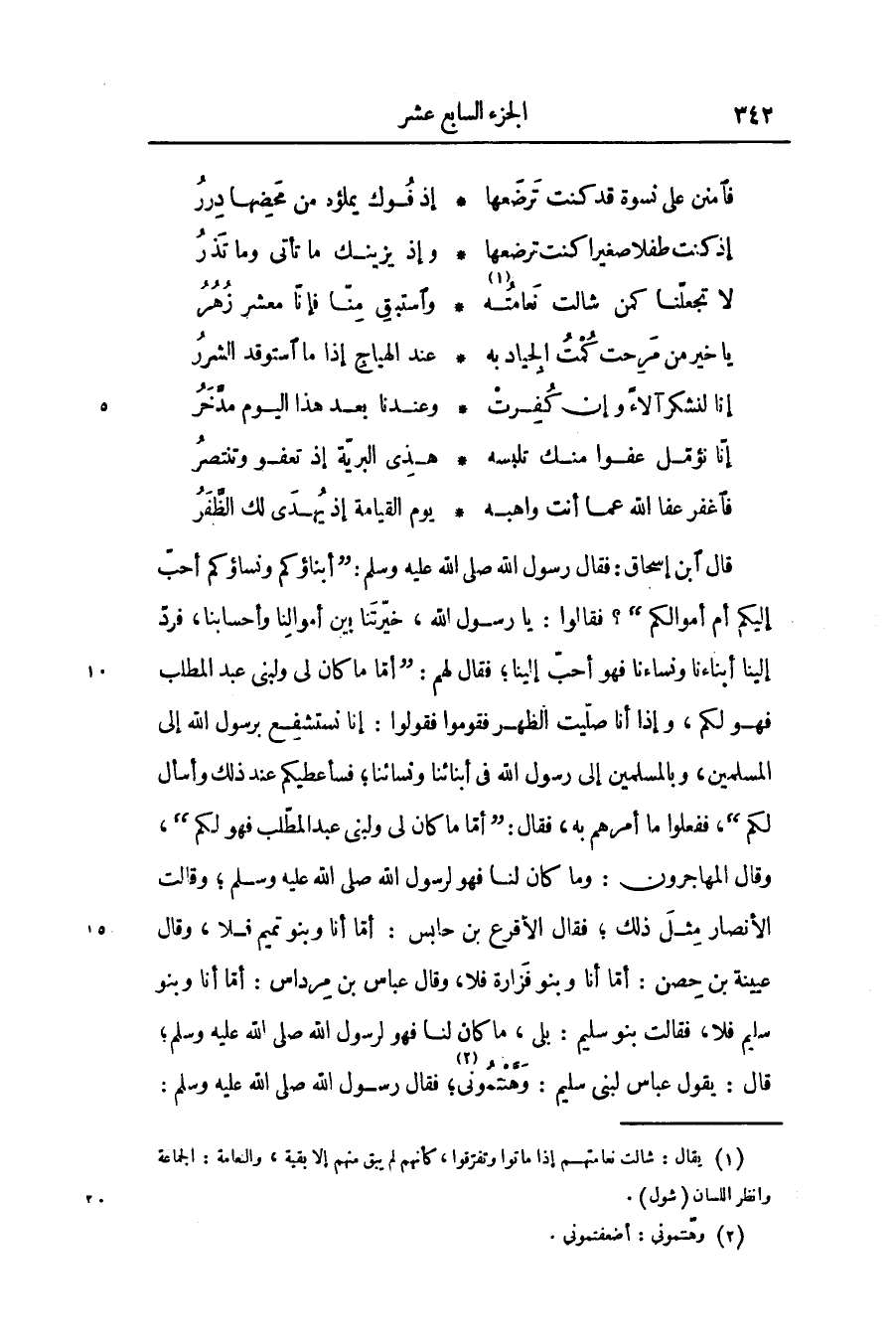 قال ابن إسحاق: فقال رسول الله صلّى الله عليه وسلّم: «أبناؤكم ونساؤكم أحبّ إليكم أم أموالكم» ؟ فقالوا: يا رسول الله، خيّرتنا بين أموالنا وأحسابنا، فردّ إلينا أبناءنا ونساءنا فهو أحبّ إلينا؛ فقال لهم: «أمّا ما كان لى ولبنى عبد المطلب فهو لكم، وإذا أنا صلّيت الظهر فقوموا فقولوا: إنا نستشفع برسول الله إلى المسلمين، وبالمسلمين إلى رسول الله فى أبناءنا ونسائنا؛ فسأعطيكم عند ذلك وأسأل لكم» ، ففعلوا ما أمرهم به؛ فقال: «أمّا ما كان لى ولبنى عبد المطّلب فهو لكم» ، وقال المهاجرون: وما كان لنا فهو لرسول الله صلّى الله عليه وسلّم؛ وقالت الأنصار مثل ذلك؛ فقال الأقرع بن حابس: أمّا أنا وبنو تميم فلا، وقال عيينة بن حصن: أمّا أنا وبنو فزارة فلا، وقال عباس بن مرداس: أمّا أنا وبنو سليم فلا، فقالت بنو سليم: بلى، ما كان لنا فهو لرسول الله صلّى الله عليه وسلّم؛ قال: يقول عباس لبنى سليم: وهّنتمونى «2» ؛ فقال رسول الله صلّى الله عليه وسلّم: