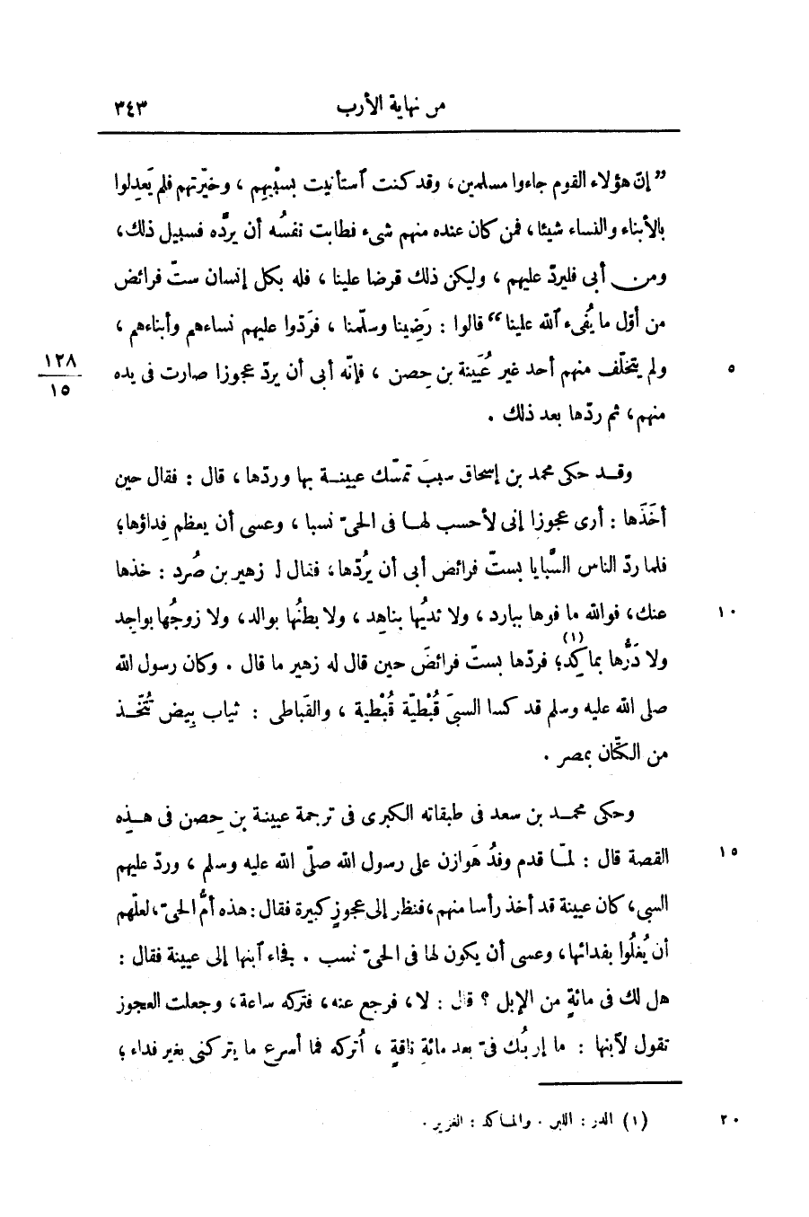 وحكى محمد بن سعد فى طبقاته الكبرى فى ترجمة عيينة بن حصن فى هذه القصة قال: لمّا قدم وفد هوازن على رسول الله صلّى الله عليه وسلّم، وردّ عليهم السبى، كان عيينة قد أخذ رأسها منهم، فنظر إلى عجوز كبيرة فقال: هذه أمّ الحىّ، لعلّهم أن يغلوا بفدائها، وعسى أن يكون لها فى الحىّ نسب. فجاء ابنها إلى عيينة فقال:
