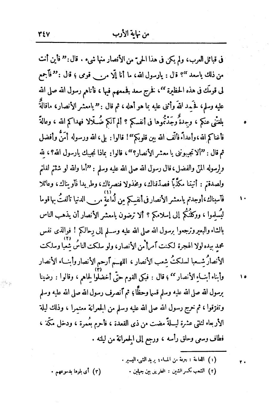 فى قبائل العرب، ولم يكن فى هذا الحىّ من الأنصار منها شىء. قال: «فأين أنت من ذلك يا سعد» ؟ قال: يا رسول الله، ما أنا إلّا من قومى؛ قال: «فاجمع لى قومك فى هذه الحظيرة» ، فخرج سعد فجمعهم فيها، فأتاهم رسول الله صلّى الله عليه وسلّم، فحمد الله وأثنى عليه بما هو أهله، ثم قال: «يا معشر الأنصار، ما قالة بلغتنى عنكم، وجدة وجدتموها فى أنفسكم؟ ألم آتكم ضلّالا فهداكم الله، وعالة فأغناكم الله، وأعداء فألّف الله بين قلوبكم» ! قالوا: بلى، الله ورسوله أمنّ وأفضل ثم قال: «ألا تجيبوننى يا معشر الأنصار؟» ؛ قالوا: بماذا نجيبك يا رسول الله؟، لله ولرسوله المنّ والفضل، قال رسول الله صلّى الله عليه وسلّم: «أما والله لو شئتم لقلتم ولصدقتم: أتيتنا مكذّبا فصدّقناك، ومخذولا فنصرناك، وطريدا فآويناك، وعائلا فآسيناك، أوجدتم يا معشر الأنصار فى أنفسكم من لعاعة «1» من الدنيا تألفت بها قوما ليسلموا، ووكلتكم إلى إسلامكم؟ ألا ترضون يا معشر الأنصار أن يذهب الناس بالشاء والبعير وترجعوا برسول الله صلّى الله عليه وسلّم إلى رحالكم! فو الذى نفس محمد بيده لولا الهجرة لكنت امرا من الأنصار، ولو سلكت الناس شعبا «2» وسلكت الأنصار شعبا لسلكت شعب الأنصار، اللهم ارحم الأنصار وأبناء الأنصار وأبناء أبناء الأنصار» ؛ قال: فبكى القوم حتّى أخضلوا «3» لحاهم، وقالوا: رضينا برسول الله صلّى الله عليه وسلّم قسما وحظّا؛ ثم انصرف رسول الله صلّى الله عليه وسلّم وتفرّقوا، ثم خرج رسول الله صلّى الله عليه وسلّم من الجعرانة معتمرا، وذلك ليلة الأربعاء لثنتى عشرة ليلة مضت من ذى القعدة، فأحرم بعمرة، ودخل مكّة، فطاف وسعى وحلق رأسه، ورجع إلى الجعرانة من ليلته.