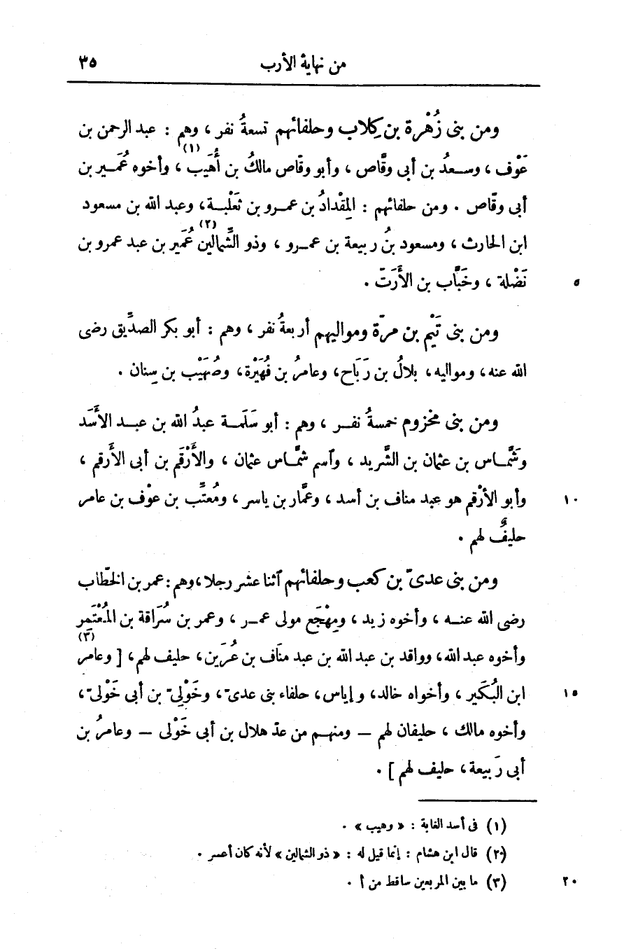 ومن بنى زهرة بن كلاب وحلفائهم تسعة نفر، وهم: عبد الرحمن بن عوف، وسعد بن أبى وقّاص، وأبو وقّاص مالك بن أهيب «1» ، وأخوه عمير بن أبى وقّاص. ومن حلفائهم: المقداد بن عمرو بن ثعلبة، وعبد الله بن مسعود ابن الحارث، ومسعود بن ربيعة بن عمرو، وذو الشّمالين «2» عمير بن عبد عمرو بن نضلة، وخبّاب بن الأرتّ.