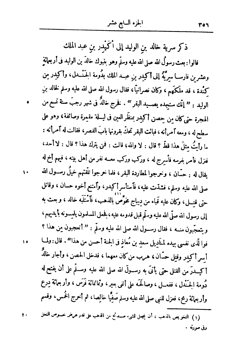 ما رأيت مثل هذا قطّ؟ قال: لا والله؛ قالت: فمن يترك هذا؟ قال: لا أحد، فنزل فأمر بفرسه فأسرج له، وركب وركب معه نفر من أهل بيته، فيهم أخ له يقال له: حسّان، وخرجوا لمطاردة البقر، فلما خرجوا تلقّتهم خيل رسول الله صلّى الله عليه وسلّم، فشدّت عليه، فاستأسر أكيدر، وامتنع أخوه حسان، وقاتل حتى قتل، وكان عليه قباء من ديباج مخوّص «1» بالذهب، فاستلبه خالد، وبعث به إلى رسول الله صلّى الله عليه وسلّم قبل قدومه عليه، فجعل المسلمون يلمسونه بأيديهم، ويتعجّبون منه، فقال رسول الله صلّى الله عليه وسلّم: «أتعجبون من هذا؟