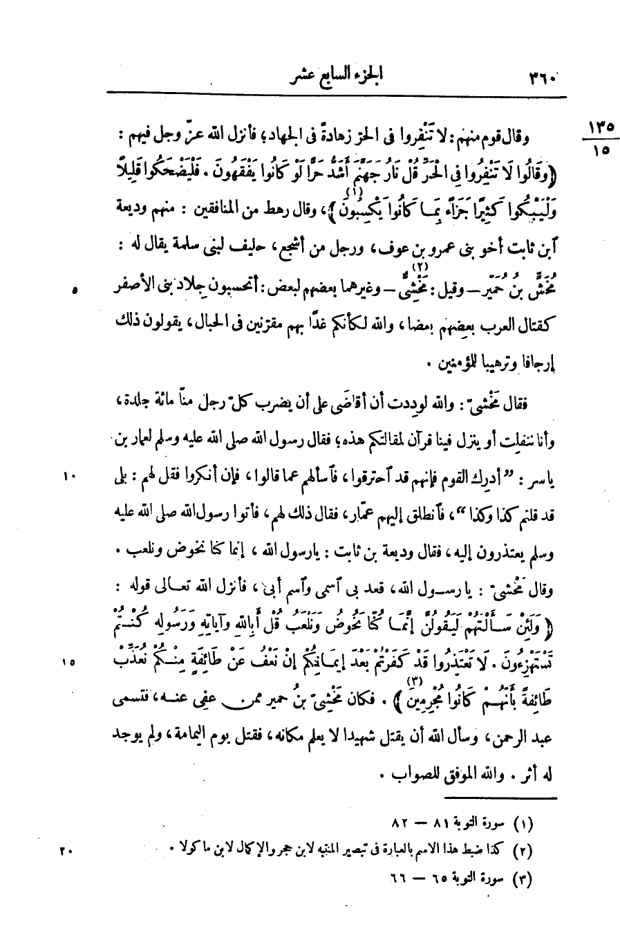 فقال مخشىّ: والله لوددت أن أقاضى على أن يضرب كلّ رجل منّا مائة جلدة، وأنا ننفلت أو ينزل فينا قرآن لمقالتكم هذه؛ فقال رسول الله صلّى الله عليه وسلّم لعمار بن ياسر: «أدرك القوم فإنهم قد احترقوا، فاسألهم عما قالوا، فإن أنكروا فقل لهم: بلى قد قلتم كذا وكذا» ، فانطلق إليهم عمّار، فقال ذلك لهم، فأتوا رسول الله صلّى الله صلّى الله عليه وسلّم يعتذرون إليه، فقال وديعة بن ثابت: يا رسول الله، إنما كنا نخوض ونلعب.