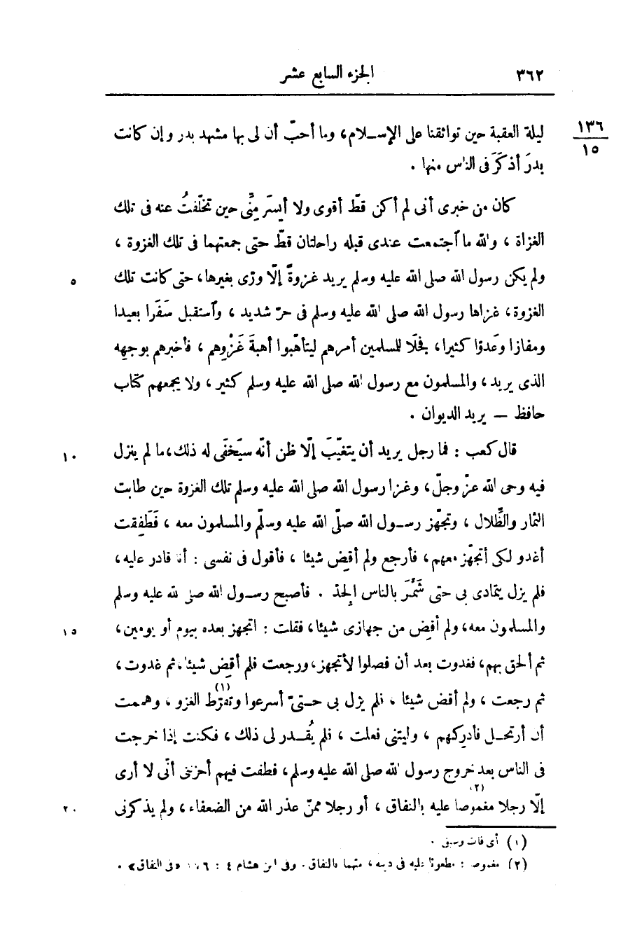 كان من خبرى أنى لم أكن قطّ أقوى ولا أيسر منّى حين تخلفت عنه فى تلك الغزاة، والله ما اجتمعت عندى قبله راحلتان قطّ حتى جمعتهما فى تلك الغزوة، ولم يكن رسول الله صلّى الله عليه وسلّم يريد غزوة إلّا ورّى بغيرها، حتى كانت تلك الغزوة، غزاها رسول الله صلّى الله عليه وسلّم فى حرّ شديد، واستقبل سفرا بعيدا ومفازا وعدوّا كثيرا، فجلا للمسلمين أمرهم ليتأهّبوا أهبة غزوهم، فأخبرهم بوجهه الذى يريد، والمسلمون مع رسول الله صلّى الله عليه وسلّم كثير، ولا يجمعهم كتاب حافظ- يريد الديوان.