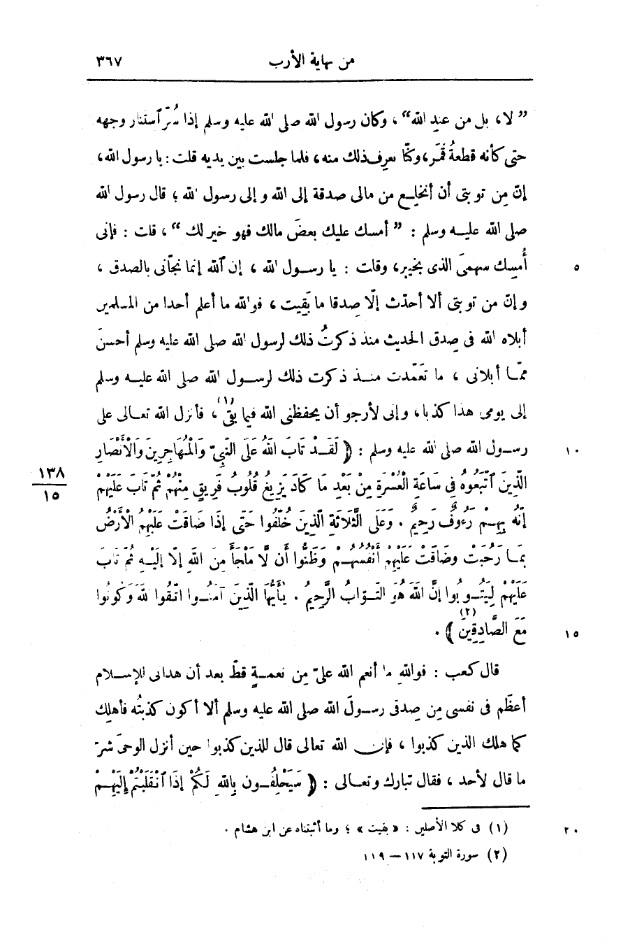 «لا، بل من عند الله» ، وكان رسول الله صلّى الله عليه وسلّم إذا سرّ استتار وجهه حتى كأنه قطعة قمر، وكنّا نعرف ذلك منه، فلما جلست بين يديه قلت: يا رسول الله، إنّ من توبتى أن أنخلع من مالى صدقة إلى الله وإلى رسول الله؛ قال رسول الله صلّى الله عليه وسلّم: «أمسك عليك بعض مالك فهو خير لك» ، قلت: فإنى أمسك سهمى الذى بخيبر، وقلت: يا رسول الله، إن الله إنما نجّانى بالصدق، وإنّ من توبتى ألا أحدّث إلّا صدقا ما بقيت، فو الله ما أعلم أحدا من المسلمين أبلاه الله فى صدق الحديث منذ ذكرت ذلك لرسول الله صلّى الله عليه وسلّم أحسن ممّا أبلانى، ما تعمّدت منذ ذكرت ذلك لرسول الله صلّى الله عليه وسلّم إلى يومى هذا كذبا، وإنى لأرجو أن يحفظنى الله فيما بقى «1» ، فأنزل الله تعالى على رسول الله صلّى الله عليه وسلّم: (لَقَدْ تابَ اللَّهُ عَلَى النَّبِيِّ وَالْمُهاجِرِينَ وَالْأَنْصارِ الَّذِينَ اتَّبَعُوهُ فِي ساعَةِ الْعُسْرَةِ مِنْ بَعْدِ ما كادَ يَزِيغُ قُلُوبُ فَرِيقٍ مِنْهُمْ ثُمَّ تابَ عَلَيْهِمْ إِنَّهُ بِهِمْ رَؤُفٌ رَحِيمٌ. وَعَلَى الثَّلاثَةِ الَّذِينَ خُلِّفُوا حَتَّى إِذا ضاقَتْ عَلَيْهِمُ الْأَرْضُ بِما رَحُبَتْ وَضاقَتْ عَلَيْهِمْ أَنْفُسُهُمْ وَظَنُّوا أَنْ لا مَلْجَأَ مِنَ اللَّهِ إِلَّا إِلَيْهِ ثُمَّ تابَ عَلَيْهِمْ لِيَتُوبُوا إِنَّ اللَّهَ هُوَ التَّوَّابُ الرَّحِيمُ. يا أَيُّهَا الَّذِينَ آمَنُوا اتَّقُوا اللَّهَ وَكُونُوا مَعَ الصَّادِقِينَ)