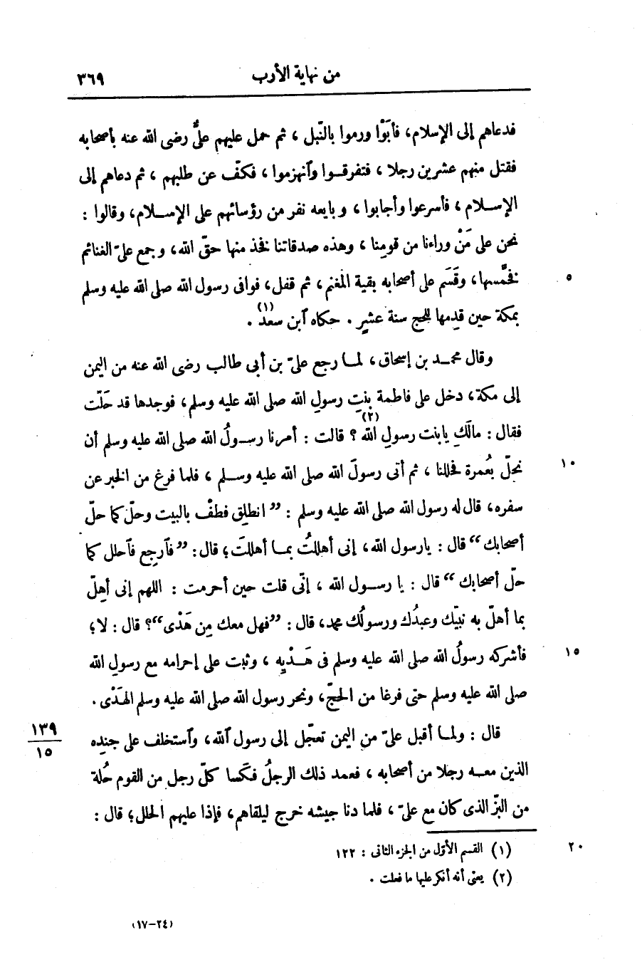 وقال محمد بن إسحاق، لما رجع علىّ بن أبى طالب رضى الله عنه من اليمن إلى مكة، دخل على فاطمة بنت رسول الله صلّى الله عليه وسلّم، فوجدها قد حلّت فقال: مالك يا بنت رسول الله «2» ؟ قالت: أمرنا رسول الله صلّى الله عليه وسلّم أن نحلّ بعمرة فحللنا، ثم أتى رسول الله صلّى الله عليه وسلّم، فلما فرغ من الخبر عن سفره، قال له رسول الله صلّى الله عليه وسلّم: «انطلق فطف بالبيت وحلّ كما حلّ أصحابك» قال: يا رسول الله، إنى أهللت بما أهللت؛ قال: «فارجع فاحلل كما حلّ أصحابك» قال: يا رسول الله، إنّى قلت حين أحرمت: اللهم إنى أهلّ بما أهلّ به نبيّك وعبدك ورسولك محمد، قال: «فهل معك من هدى» ؟ قال: لا، فأشركه رسول الله صلّى الله عليه وسلّم فى هديه، وثبت على إحرامه مع رسول الله صلّى الله عليه وسلّم حتى فرغا من الحجّ، ونحر رسول الله صلّى الله عليه وسلّم الهدى.