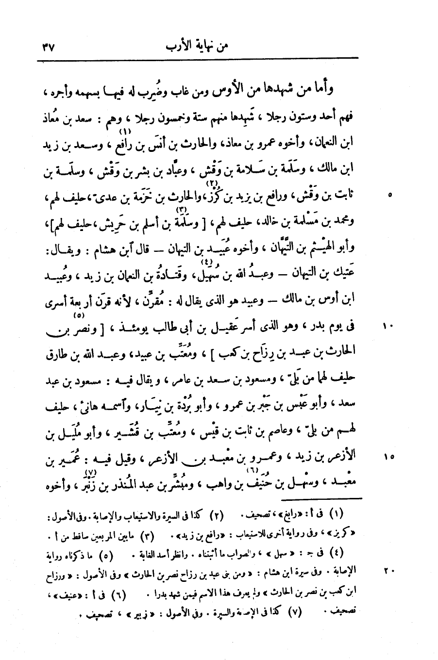 وأما من شهدها من الأوس ومن غاب وضرب له فيها بسهمه وأجره، فهم أحد وستون رجلا، شهدها منهم ستة وخمسون رجلا، وهم: سعد بن معاذ ابن النعمان، وأخوه عمرو بن معاذ، والحارث بن أنس بن رافع «1» ، وسعد بن زيد ابن مالك، وسلمة بن سلامة بن وقش، وعبّاد بن بشر بن وقش، وسلمة بن ثابت بن وقش، ورافع بن يزيد بن كرز «2» ، والحارث بن خزمة بن عدىّ، حليف لهم، ومحمد بن مسلمة بن خالد، حليف لهم، [وسلمة «3» بن أسلم بن حريش، حليف لهم] ، وأبو الهيثم بن التّيّهان، وأخوه عبيد بن التيهان- قال ابن هشام: ويقال: