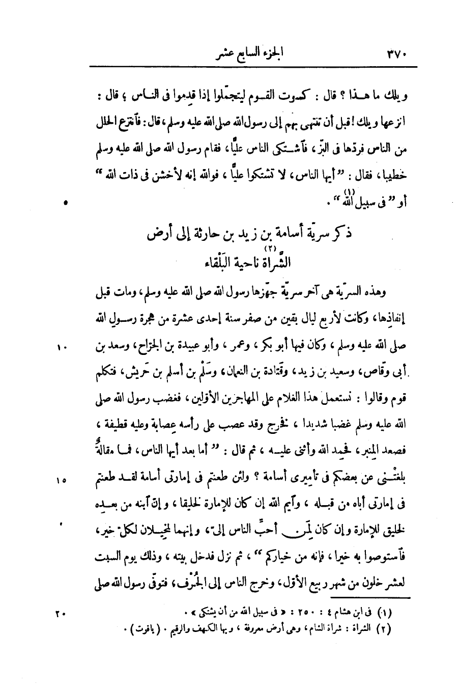 وهذه السريّة هى آخر سريّة جهّزها رسول الله صلّى الله عليه وسلّم، ومات قبل إنفاذها، وكانت لأربع ليال بقين من صفر سنة إحدى عشرة من هجرة رسول الله صلّى الله عليه وسلّم، وكان فيها أبو بكر، وعمر، وأبو عبيدة بن الجرّاح، وسعد بن أبى وقّاص، وسعيد بن زيد، وقتادة بن النعمان، وسلّم بن أسلم بن حريش، فتكلم قوم وقالوا: نستعمل هذا الغلام على المهاجرين الأوّلين، فغضب رسول الله صلّى الله عليه وسلّم غضبا شديدا، فخرج وقد عصب على رأسه عصابة وعليه قطيفة، فصعد المنبر، فحمد الله وأثنى عليه، ثم قال: «أما بعد أيها الناس، فما مقالة بلغتنى عن بعضكم فى تأميرى أسامة؟ ولئن طعنتم فى إمارتى أسامة لقد طعنتم فى إمارتى أباه من قبله، وايم الله إن كان للإمارة لخليقا، وإنّ ابنه من بعده لخليق للإمارة وإن كان لمن أحبّ الناس إلىّ، وإنهما لمخيلان لكلّ خير، فاستوصوا به خيرا، فإنه من خياركم» ، ثم نزل فدخل بيته، وذلك يوم السبت لعشر خلون من شهر ربيع الأوّل، وخرج الناس إلى الجرف، فتوفّى رسول الله صلّى