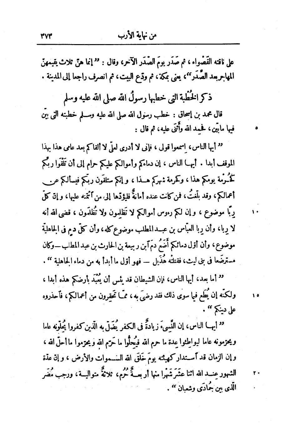 «أيها الناس، إن النّسىء زيادة فى الكفر يضلّ به الّذين كفروا يحلّونه عاما ويحرّمونه عاما ليواطئوا عدّة ما حرم الله فيحلّوا ما حرّم الله ويحرّموا ما أحلّ الله، وإن الزمان قد استدار كهيئته يوم خلق الله السموات والأرض، وإنّ عدّة الشهور عند الله اثنا عشر شهرا منها أربعة حرم، ثلاثة متوالية، ورجب مضر الّذى بين جمادى وشعبان» .