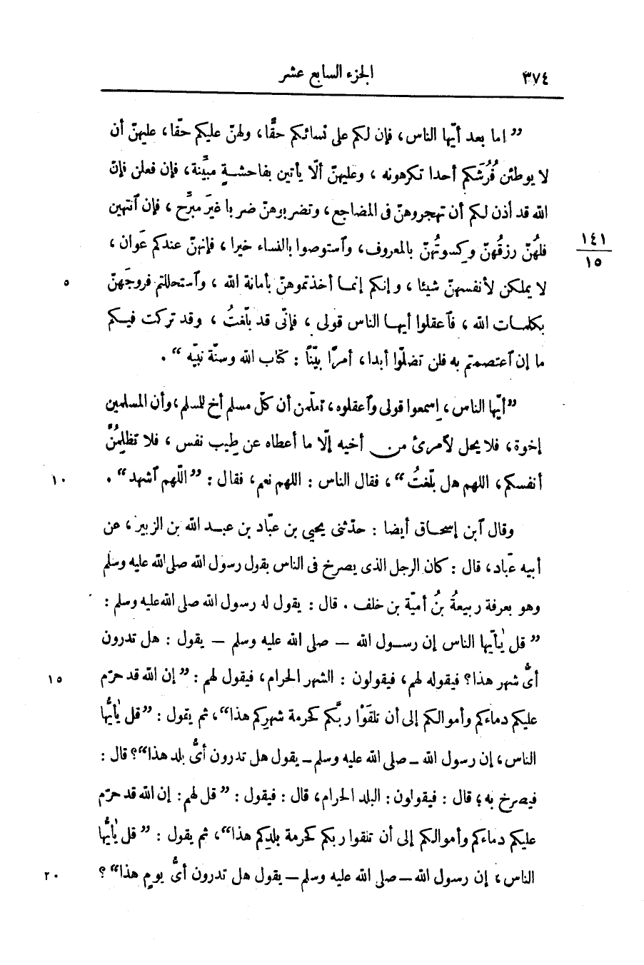 «قل يأيّها الناس إن رسول الله- صلّى الله عليه وسلّم- يقول: هل تدرون أىّ شهر هذا؟ فيقوله لهم، فيقولون: الشهر الحرام، فيقول لهم: «إن الله قد حرّم عليكم دماءكم وأموالكم إلى أن تلقوا ربّكم كحرمة شهركم هذا» ، ثم يقول: «قل يأيّها الناس، إن رسول الله- صلى الله عليه وسلّم- يقول هل تدرون أىّ بلد هذا؟» قال: