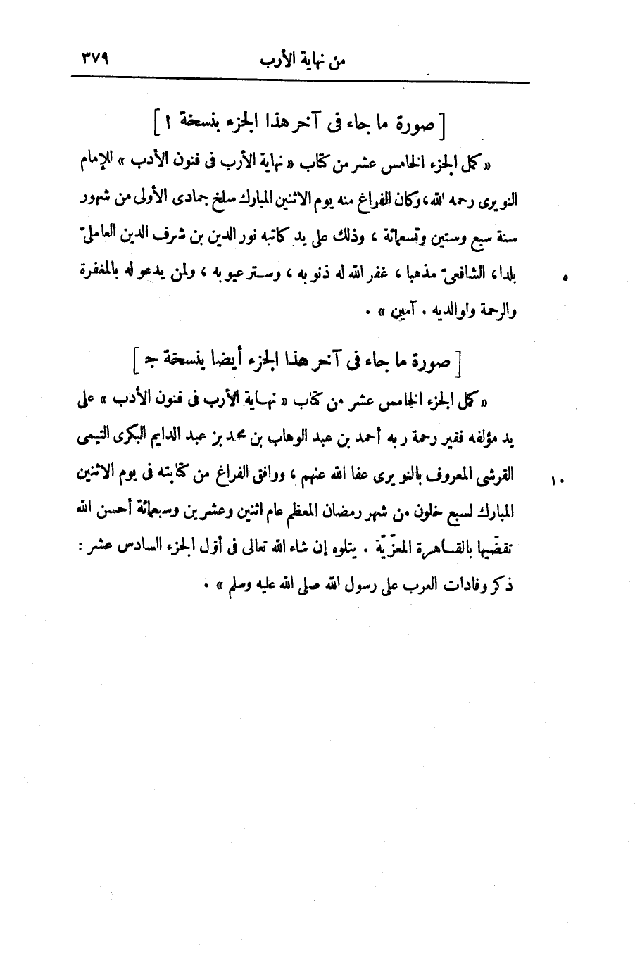 «كمل الجزء الخامس عشر من كتاب «نهاية الأرب فى فنون الأدب» للإمام النويرى رحمه الله، وكان الفراغ منه يوم الاثنين المبارك سلخ جمادى الأولى من شهور سنة سبع وستين وتسعمائة، وذلك على يد كاتبه نور الدين بن شرف الدين العاملىّ بلدا، الشافعىّ مذهبا، غفر الله له ذنوبه، وستر عيوبه، ولمن يدعو له بالمغفرة والرحمة ولوالديه. آمين» .