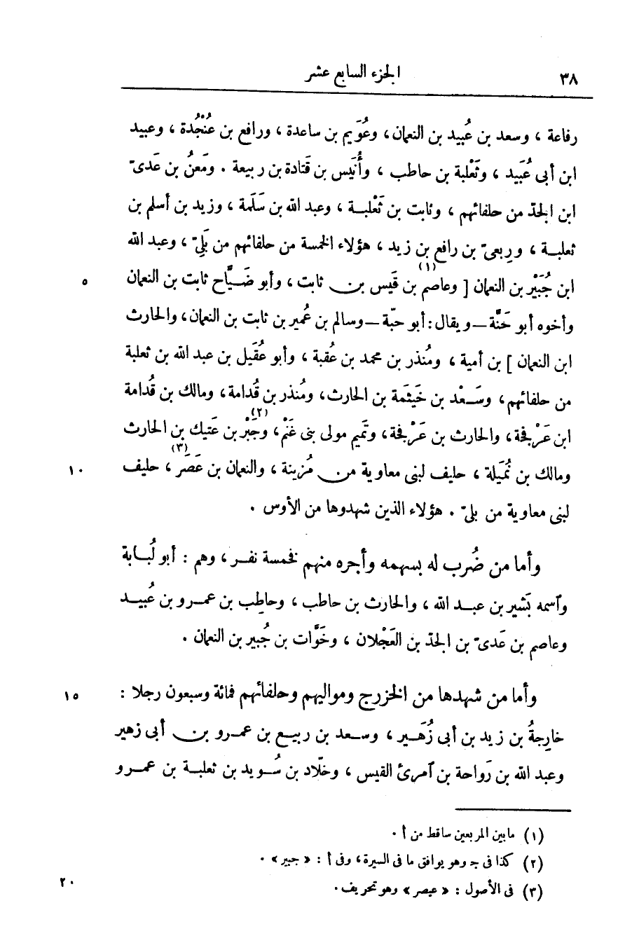 وأما من ضرب له بسهمه وأجره منهم فخمسة نفر، وهم: أبو لبابة واسمه بشير بن عبد الله، والحارث بن حاطب، وحاطب بن عمرو بن عبيد وعاصم بن عدىّ بن الجدّ بن العجلان، وخوّات بن جبير بن النعمان.