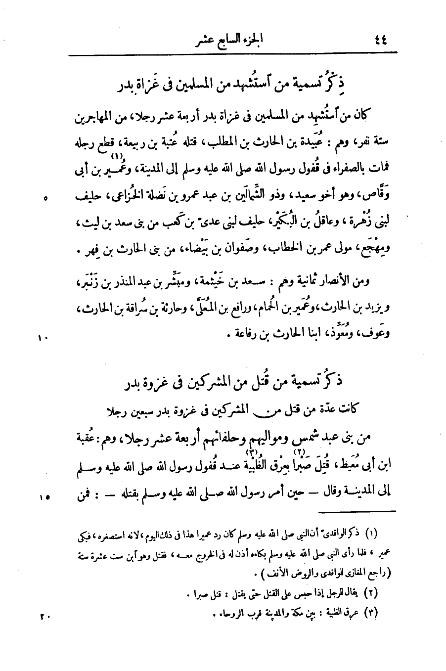 كان من استشهد من المسلمين فى غزاة بدر أربعة عشر رجلا، من المهاجرين ستة نفر، وهم: عبيدة بن الحارث بن المطلب، قتله عتبة بن ربيعة، قطع رجله فمات بالصفراء فى قفول رسول الله صلّى الله عليه وسلّم إلى المدينة، وعمير «1» بن أبى وقّاص، وهو أخو سعيد، وذو الشّمالين بن عبد عمرو بن نضلة الخزاعى، حليف لبنى زهرة، وعاقل بن البكير، حليف لبنى عدىّ بن كعب من بنى سعد بن ليث، ومهجع، مولى عمر بن الخطاب، وصفوان بن بيضاء، من بنى الحارث بن فهر.