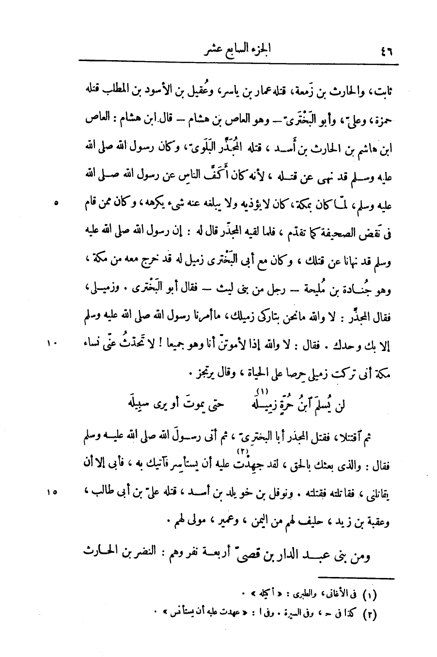 ثابت، والحارث بن زمعة، قتله عمار بن ياسر، وعقيل بن الأسود بن المطلب قتله حمزة، وعلىّ، وأبو البخترىّ- وهو العاص بن هشام- قال ابن هشام: العاص ابن هاشم بن الحارث بن أسد، قتله المجذّر البلوىّ، وكان رسول الله صلّى الله عليه وسلّم قد نهى عن قتله، لأنه كان أكفّ الناس عن رسول الله صلّى الله عليه وسلّم، لمّا كان بمكة، كان لا يؤذيه ولا يبلغه عنه شىء يكرهه، وكان ممن قام فى نقض الصحيفة كما تقدّم، فلما لقيه المجذّر قال له: إن رسول الله صلّى الله عليه وسلّم قد نهانا عن قتلك، وكان مع أبى البخترى زميل له قد خرج معه من مكة، وهو جنادة بن مليحة- رجل من بنى ليث- فقال أبو البخترى، وزميلى، فقال المجذّر: لا والله ما نحن بتاركى زميلك، ما أمرنا رسول الله صلّى الله عليه وسلّم إلا بك وحدك. فقال: لا والله إذا لأموتنّ أنا وهو جميعا! لا تحدّث عنّى نساء مكة أنى تركت زميلى حرصا على الحياة، وقال يرتجز.