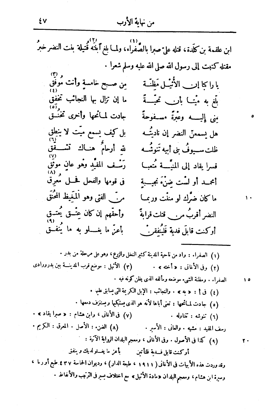ابن علقمة بن كلدة، قتله علىّ صبرا بالصّفراء «1» ، ولما بلغ ابنته «2» قتيلة بنت النضر خبر مقتله كتبت إلى رسول الله صلّى الله عليه وسلّم شعرا.