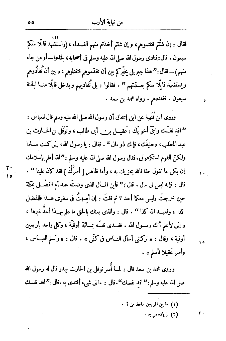 «افد نفسك وابنى أخويك: عقيل بن أبى طالب، ونوفل بن الحارث بن عبد المطلب، وحليفك، فإنك ذو مال» . فقال: يا رسول الله، إنى كنت مسلما ولكنّ القوم استكرهونى. فقال رسول الله صلّى الله عليه وسلّم: «الله أعلم بإسلامك إن يكن ما تقول حقا فالله يجزيك به، وأما ظاهر [أمرك «2» ] فقد كان علينا» .